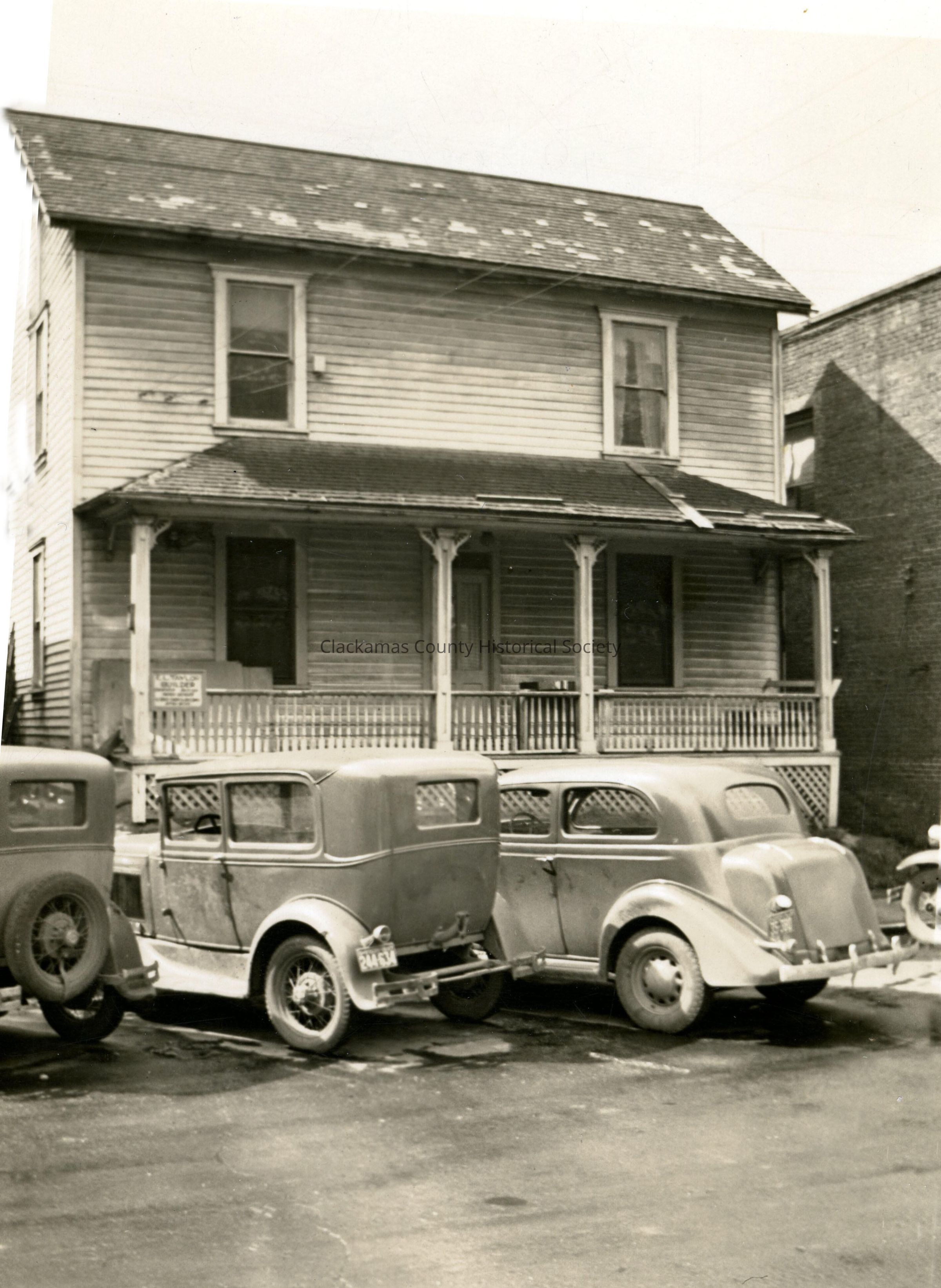 Pioneer House at 208 8th Street, near the Oregon City Enterprise. Back of photograph states that Mertie was born there, and it was between the shoe store and the Enterprise Courier. (Removed - either demoed or relocated - between 1937 and 1940 - JAH 2/2025)Made/Created