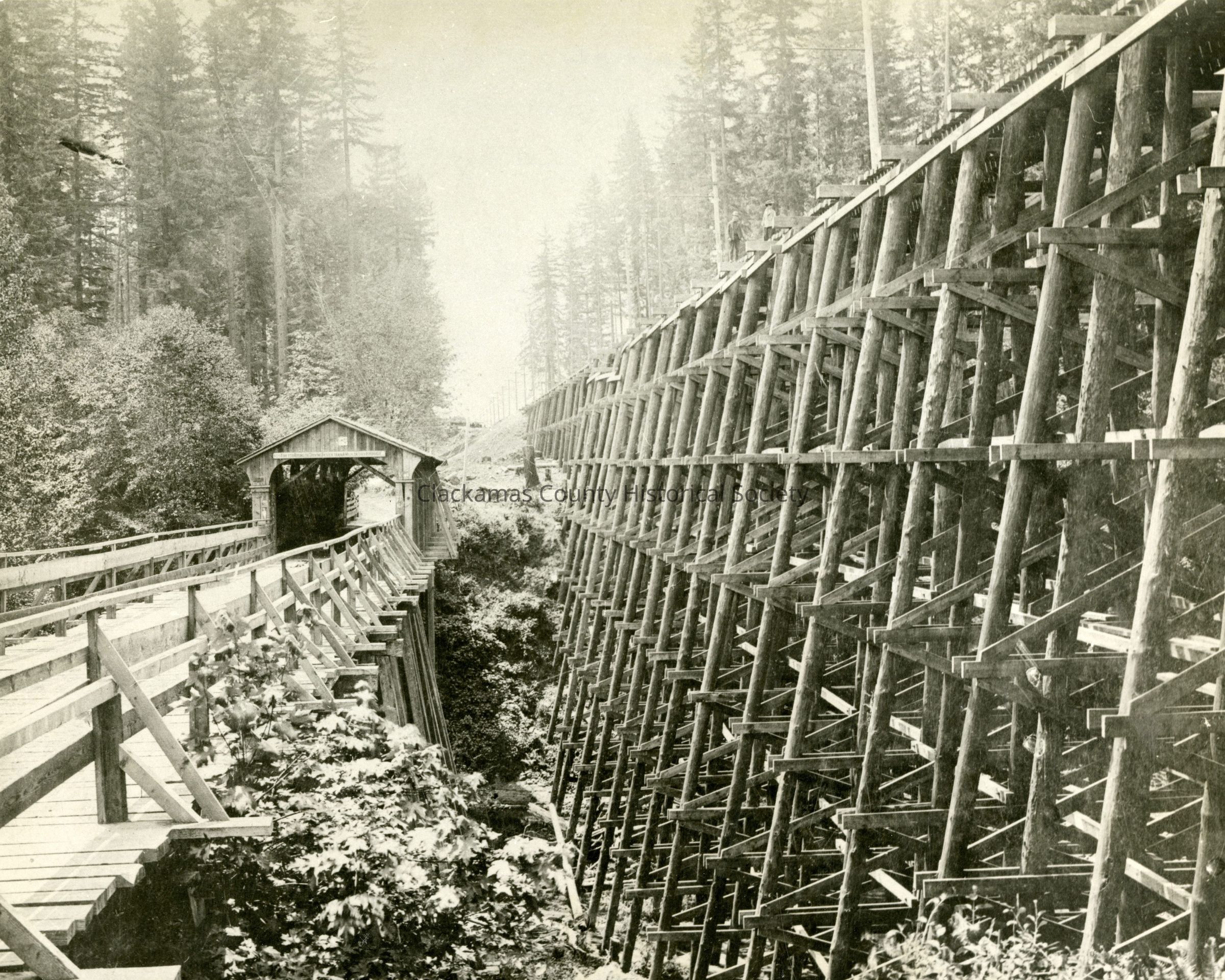 Eagle Creek Covered Bridge and Railroad Pile, 1903. Railroad Center Pile 105' tall. Tallest of its kind when built.