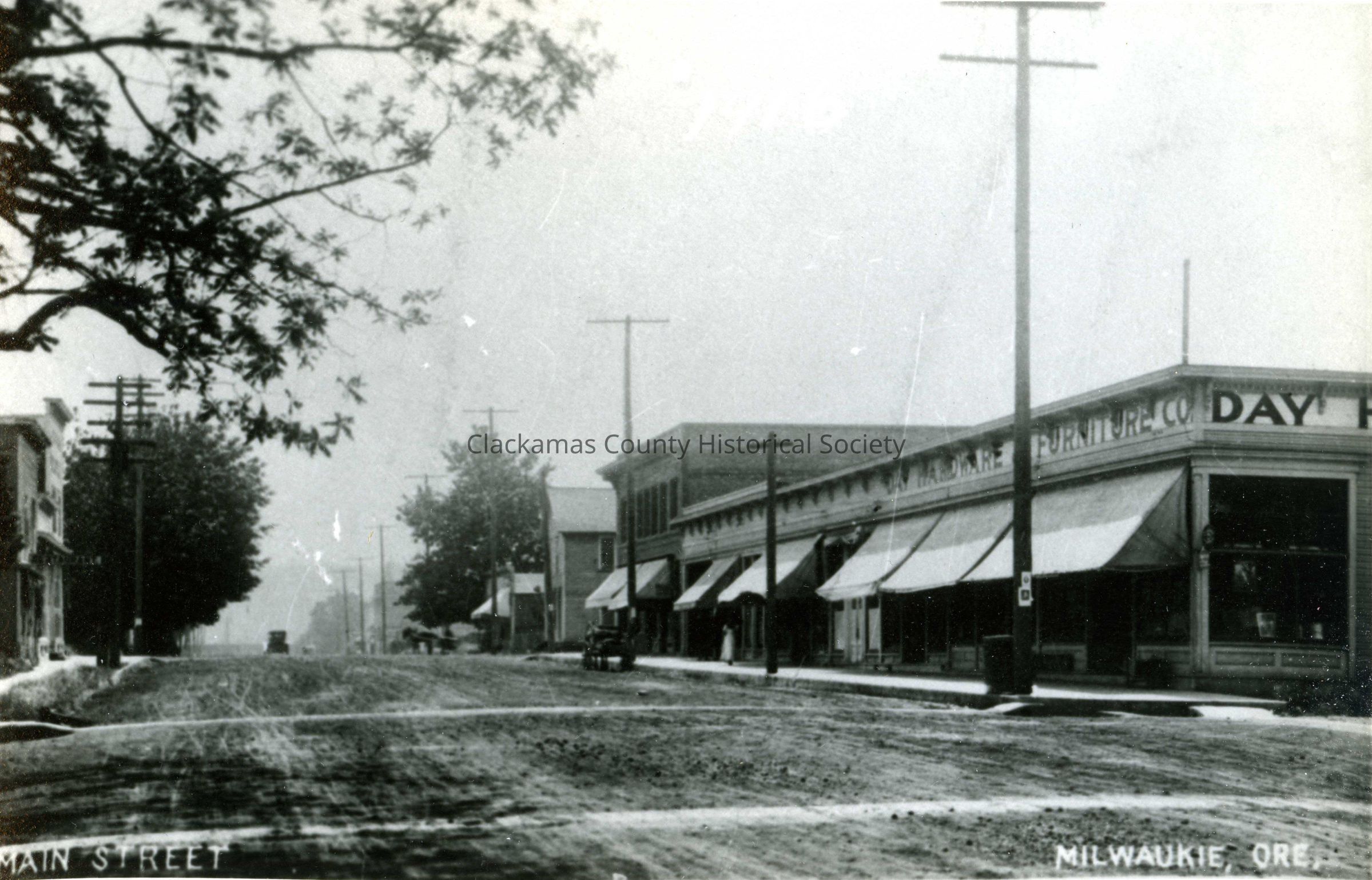 Milwaukie Main Street, 1916. On the right side corner of Main and Jackson Streets was Walter Day's hardware store. Next was Monroe's motion picture show, then Kinzel's Box Factory, next a shoe shop run by Joe Bushman. The two story building at the end of the block was the First State Bank of Milwaukie. Beyond Monroe street on the right side was John Snyder's Bakery, on the left were only two business establishments at that time. The farther one was a grocery store run by E.T. Elmer and the other a restaurant operated by Mr. and Mrs. Cash.Made/Created