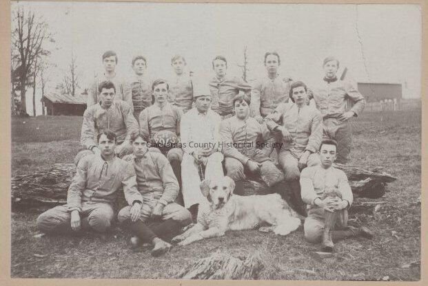 Pictured is the Boys Team of the Oregon City, Oregon, Eastham High School. The team is seated on a log with a dog in the foreground. E. Meresse