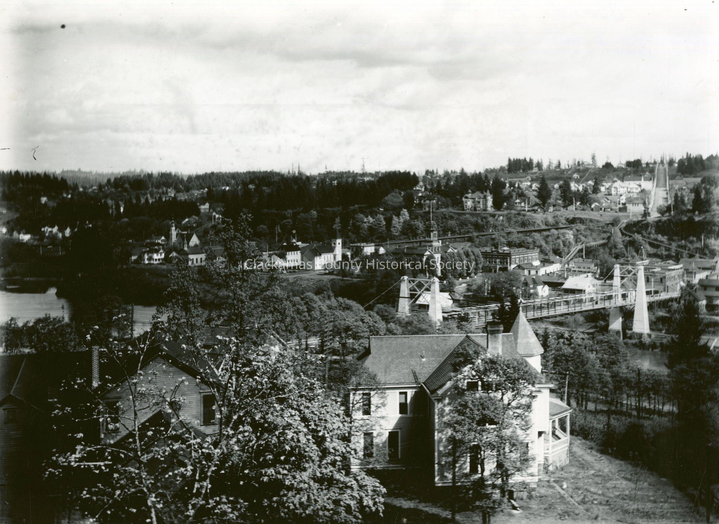 Moffatt Residence, Willamette Falls Drive, West Linn. The suspension bridge and Oregon City are in the background.Made/Created