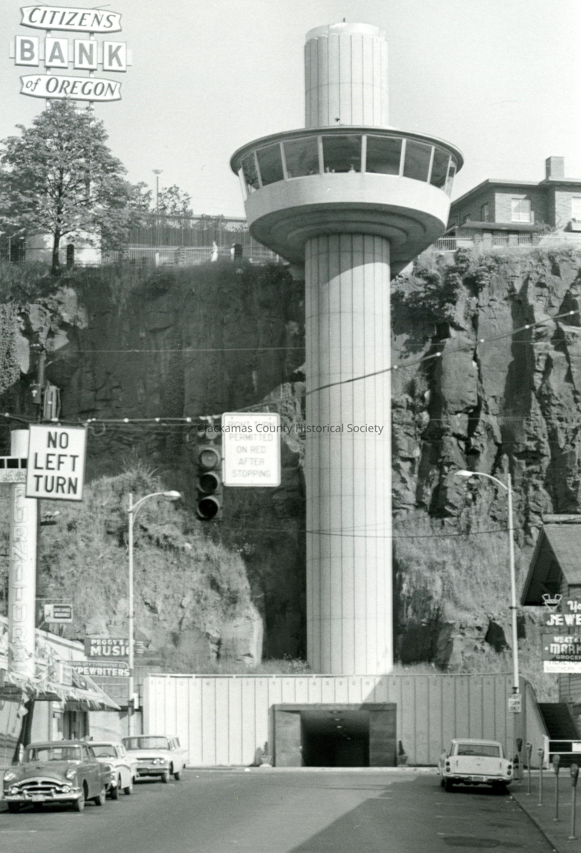 Oregon City elevator. Citizens Bank of Oregon. Peggy's Music. Young's Jewelry. Other businesses. Cars on street. Chase House is Gone.Made/Created
