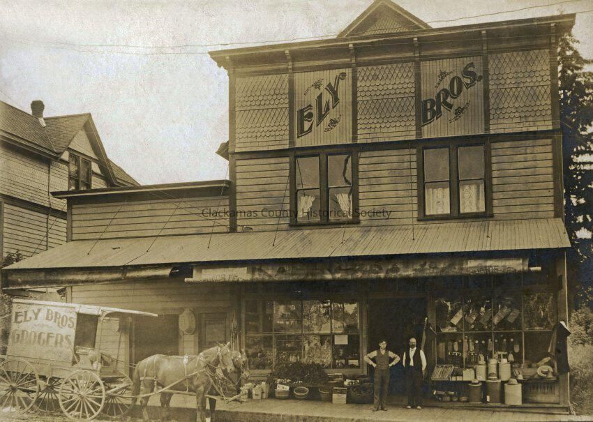 Ely Brothers Grocery. 7th Street, Oregon City. Intersection of 7th between Madison and Monroe. 906 7th Street. Horses and delivery wagon.Made/Created