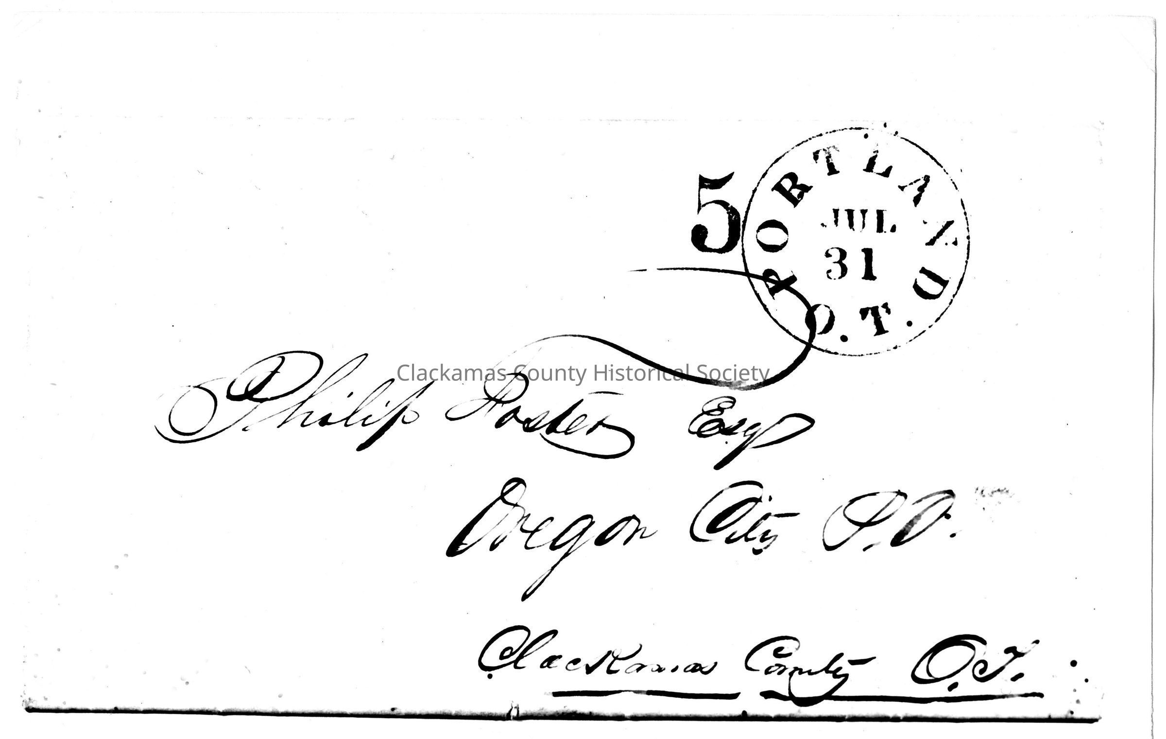 Envelope addressed to Philip Foster from Portland, O. T. to Oregon City. July 31 on postmark.Made/Created