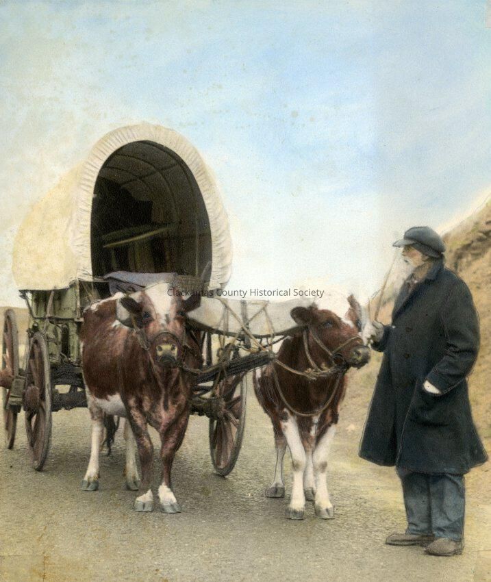 Ezra Meeker with Ox Team and Wagon. Note on back reads, " Ezra Meeker and start of return trip over original road to Oregon. After returning from the trip Mr. Meeker went to San Bernardina and opened a small business and had my brother's firm do the air conditioning, ertc. He was glad to know some Oretgon people and they enjoyed talking over his two trips and the changes they saw." Mrs. M.J. (Ted) Cockrell, 5330 Broadway, West Linn, Oregon. 10 Mar 1973.Made/Created