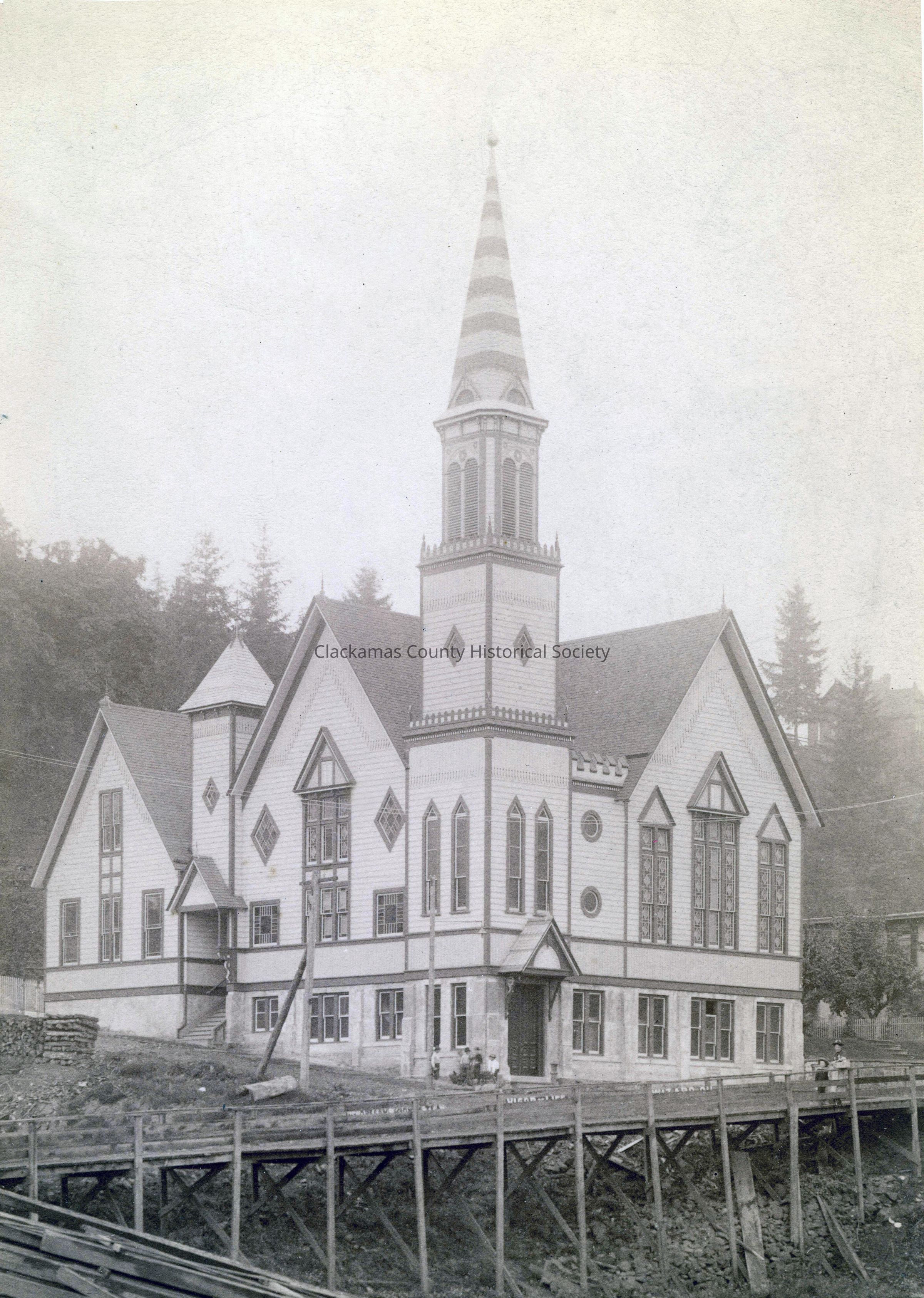 The First Congregational Church was built in 1889 at the same location as the older church at Moss and Main Streets. This structure was destroyed by a fire at 2 a.m. on Feb. 4th, 1923. The lot is now the current location of the Clackamas County Community Corrections building.Made/Created