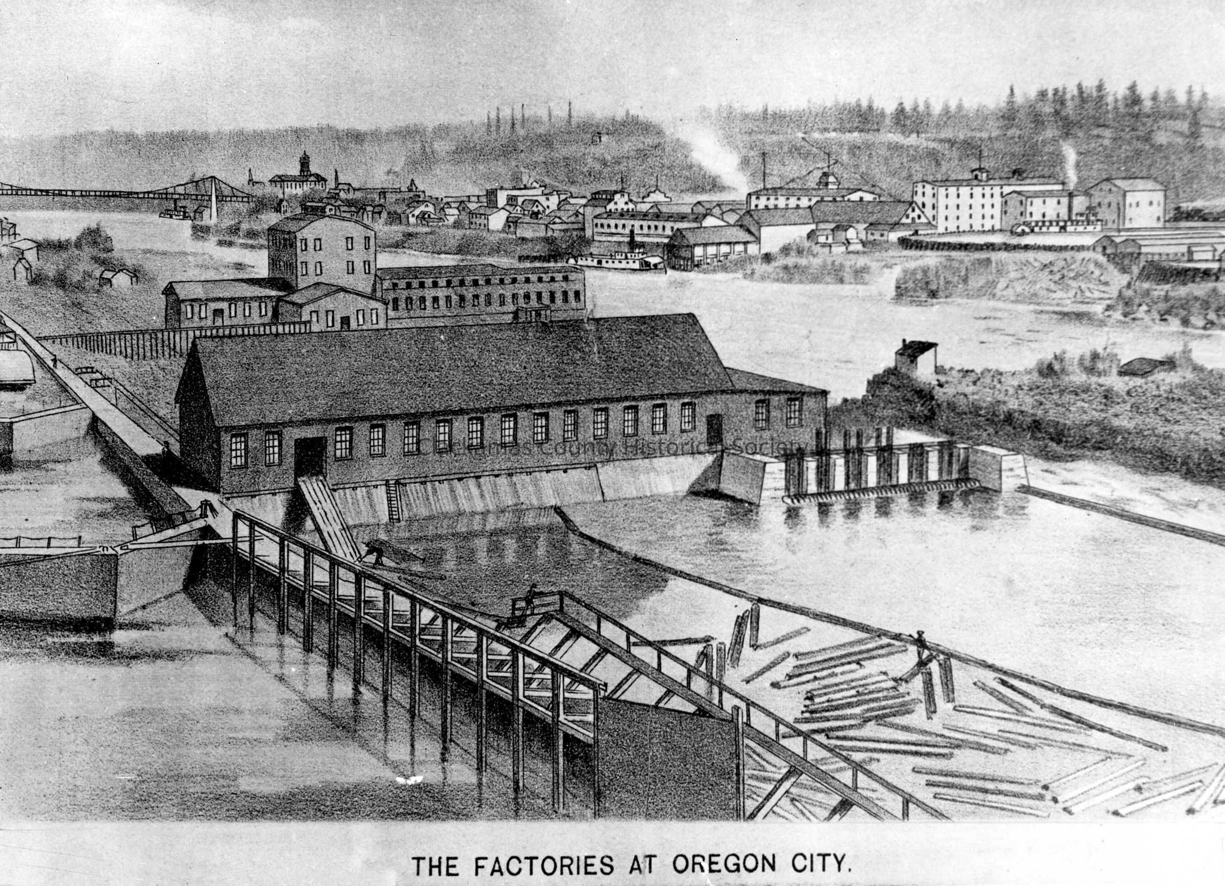 Factories at Willamette Falls, pencil sketch, 1888. West Linn mills in foreground and Oregon City in background. Sketch from West Shore magazine.Made/Created