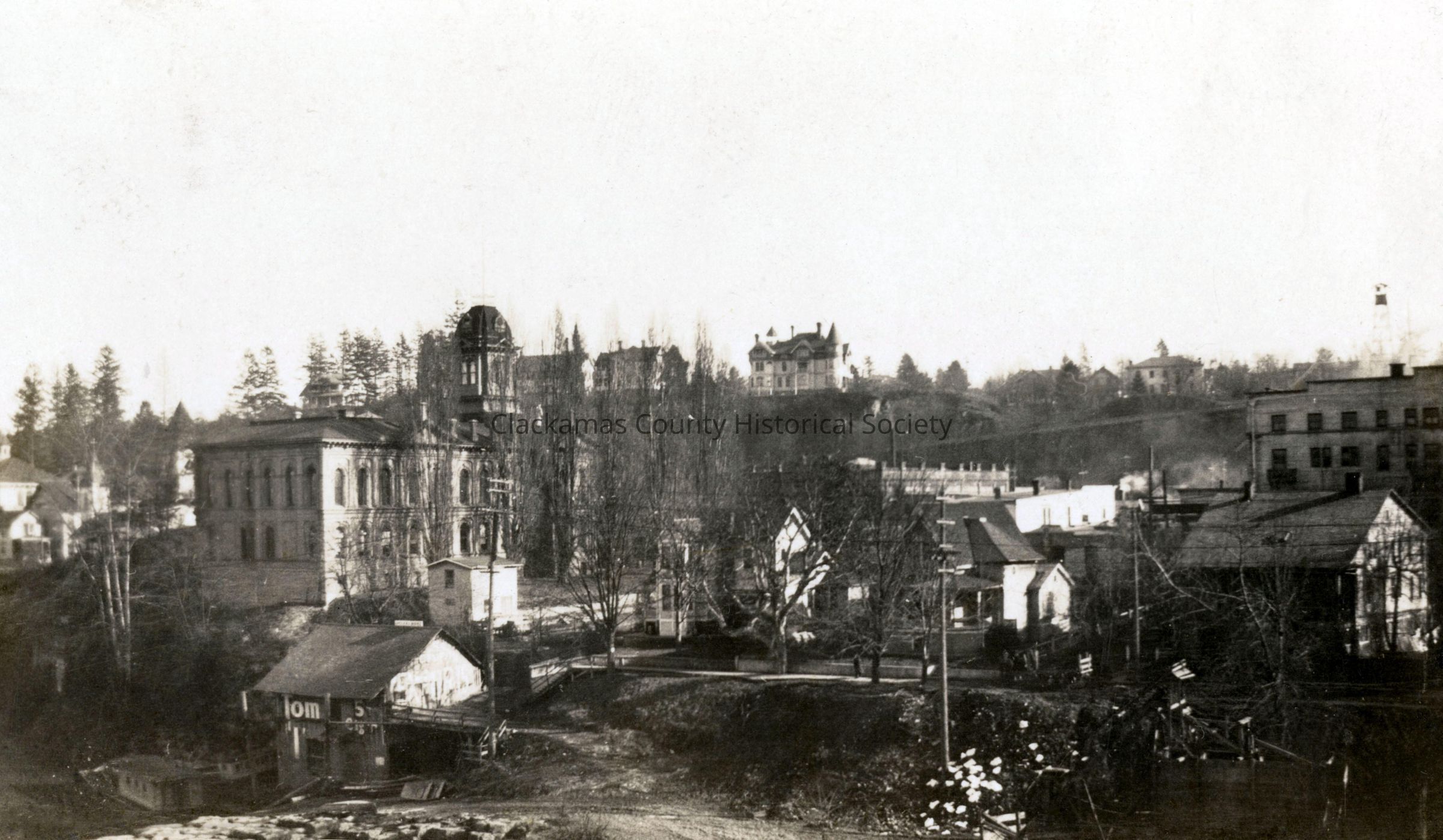 Oregon City, Oregon. Photo shows courthouse, 8th Street Dock, Chase house, and other houses on the bluff. Before Elevator