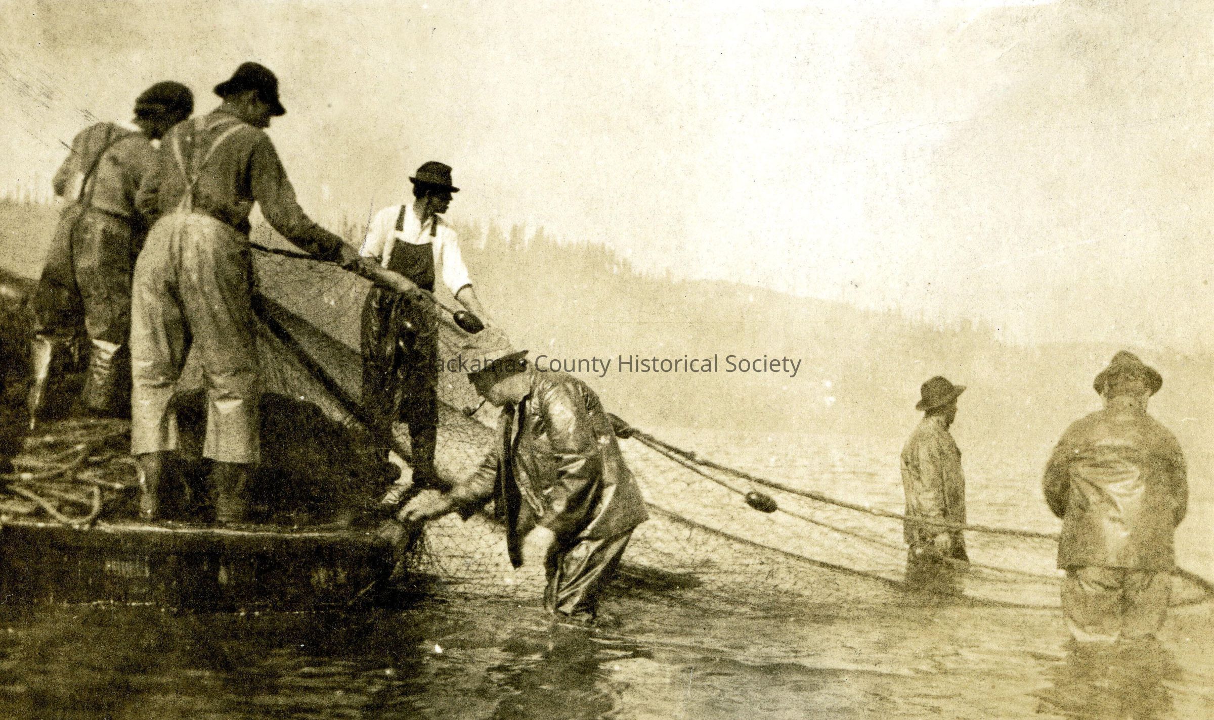 Fisherman netting fish. Postcard. 6 fishermen netting fish and boat.