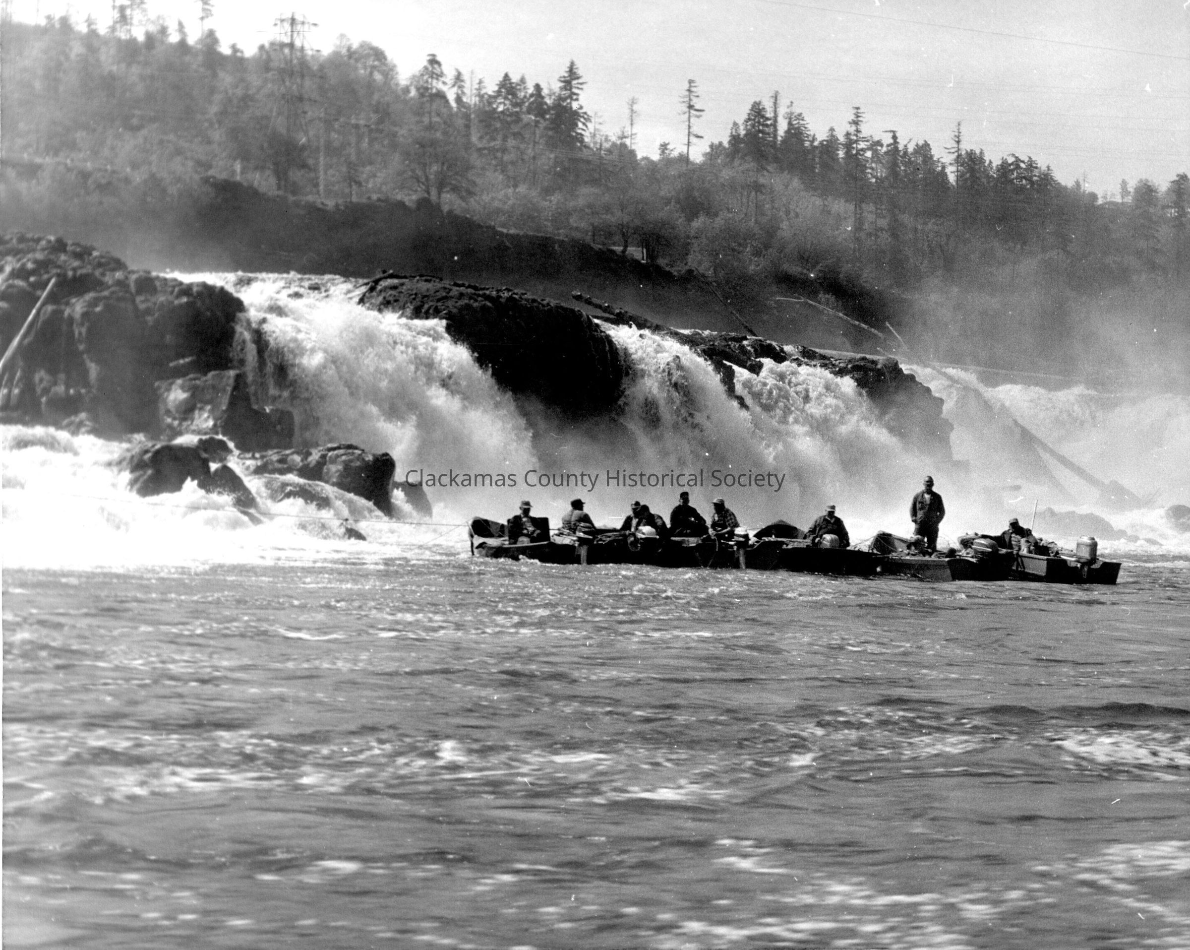 Fishing at Willamette Falls. "Hoglines". Boats, fishermen.