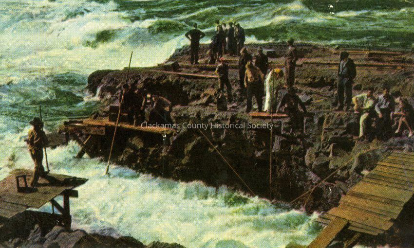 Fishing Celilo Falls in the Columbia Gorge. Postcard 54 in Union Oil Company's Natural Color Photographic Scenes of the West. By special treaty with the government, Native Americans fish at Celilo Falls on the Columbia river as they have for centuries, with spear and net. This area was first visited by Lewis and Clark when they completed their portage around the rapids and encamped on the north shore of the river in 1805.Made/Created