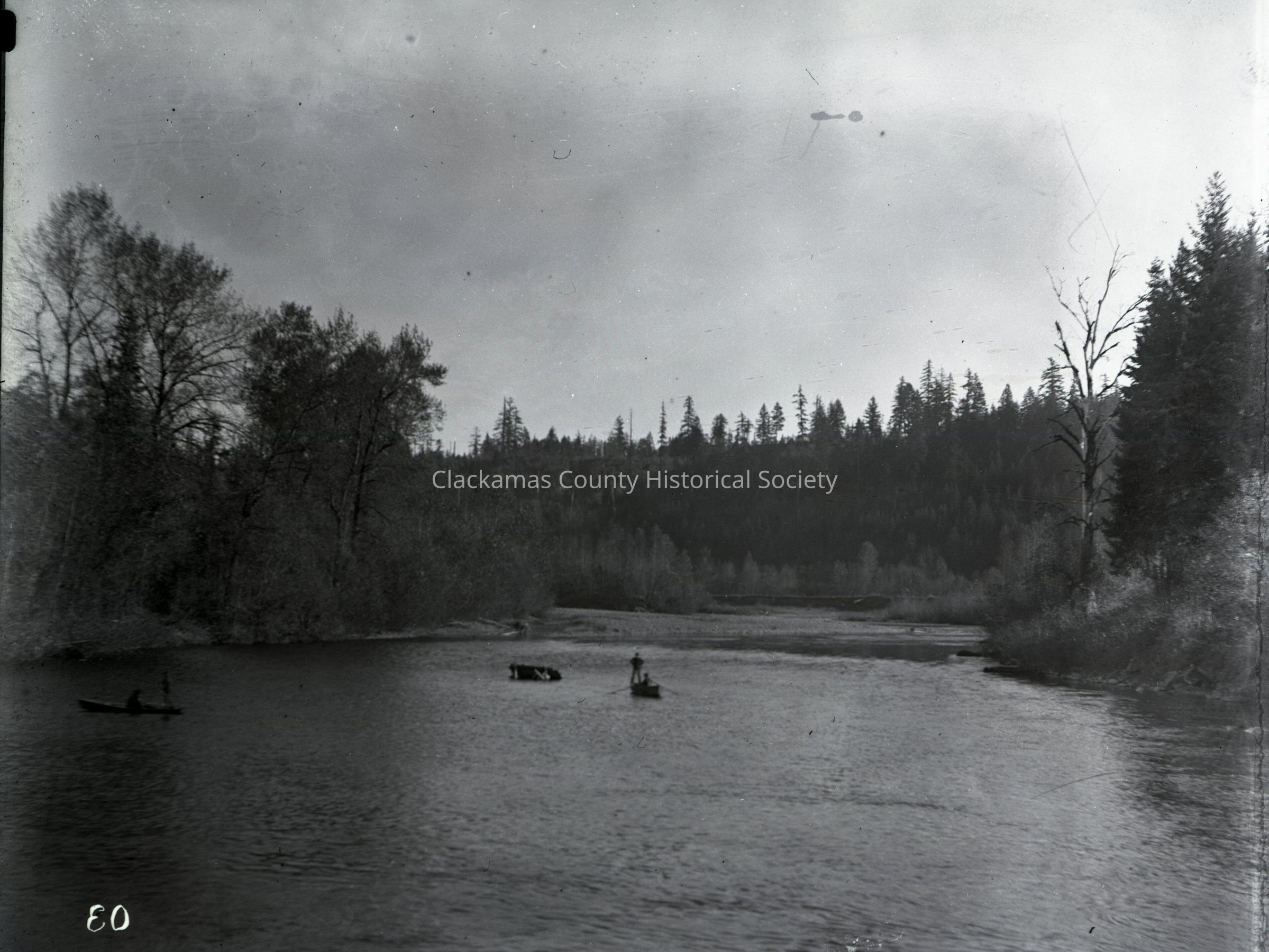Fishing on the Clackamas River above Railroad Bridge and Park Place. Glass negative in envelope with photograph attached.Made/Created