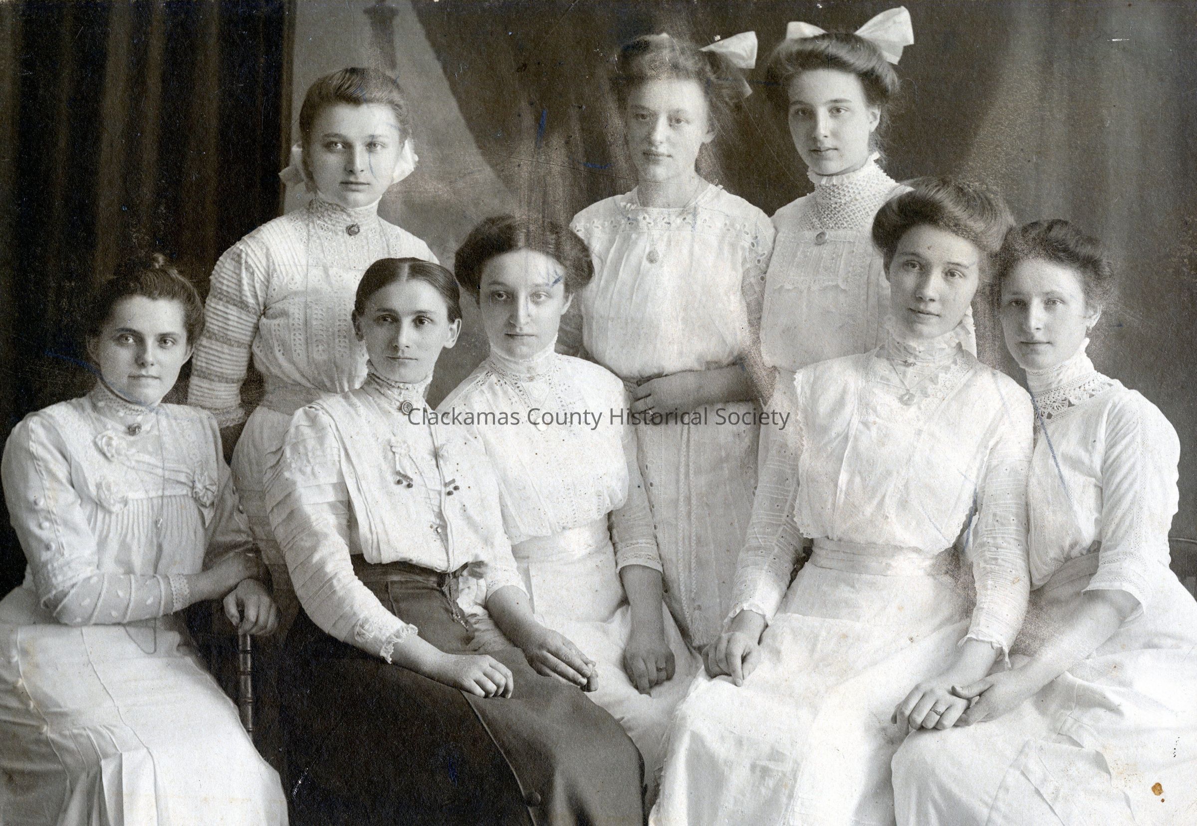 Friends and relatives of Hopp family. Possible graduation picture 8 young women Joanna Hopp Quade - fourth from left (JAH 10/2024), August Hopp, fifth,