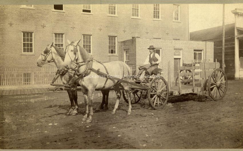 Mr. Gane Sheppard who married Lillia ??? drove one of Clark ??? (father-in-law) drays. 1889 Oregon City, Main St. in front of Woolen Mill Office before addition of 1891