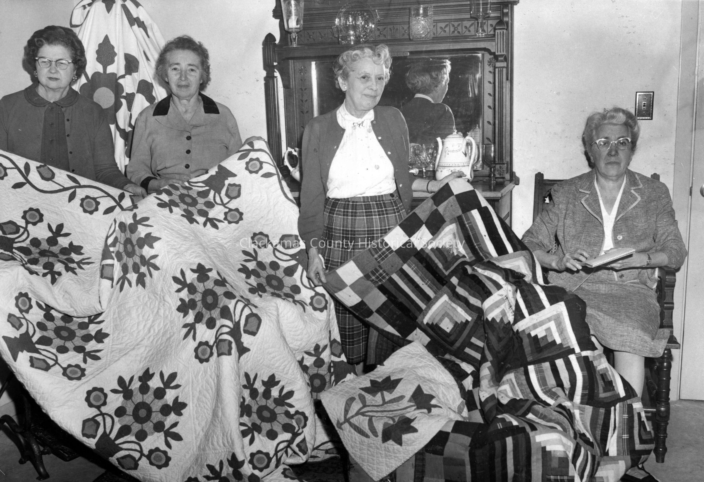 Georgia Farmer and Ladies with Clackamas County Historical Society Quilts. Georgia Farmer is at the far right. Adeline Crawfords quilt, left front.Made/Created