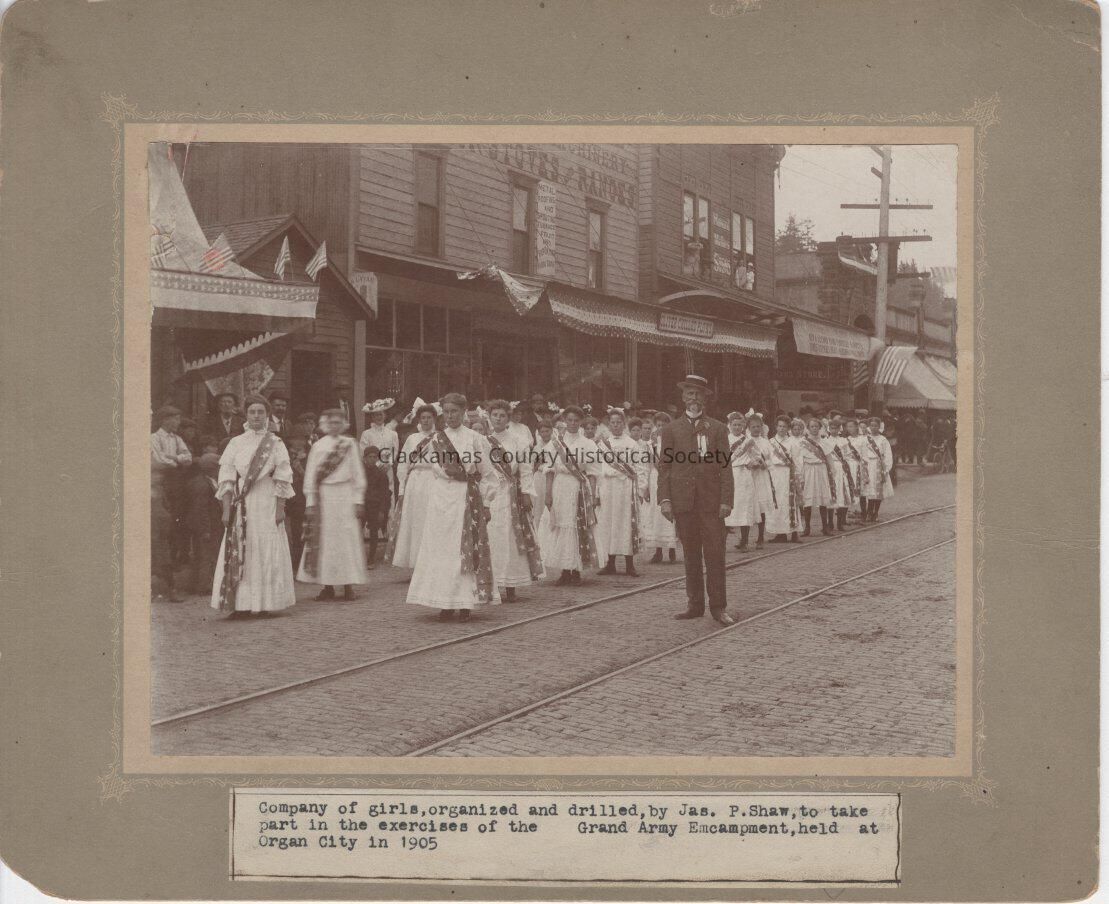 Company of girls drilled by Jas. P. Shaw to take part in the Grand Army Emcampment at Oregon City in 1905