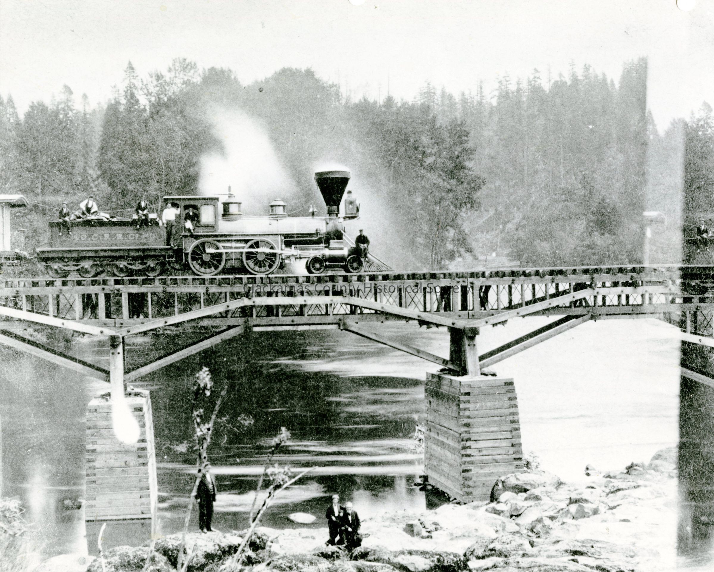 Clackamas River Railroad Bridge about 1869. Gladstone. First bridge built and first engine to pass. Two copies. T-1400.003012