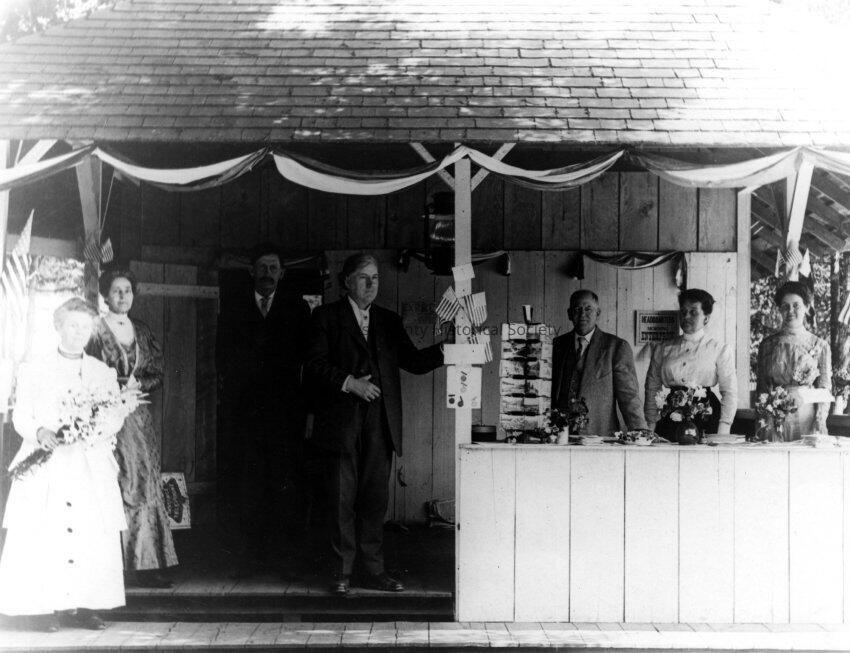 Chautauqua Headquarters, Gladstone, OR. Eva Emery Dye (with flowers) and Charles Dye. Mr. and Mrs. Harvey Cross. 1905-1907?