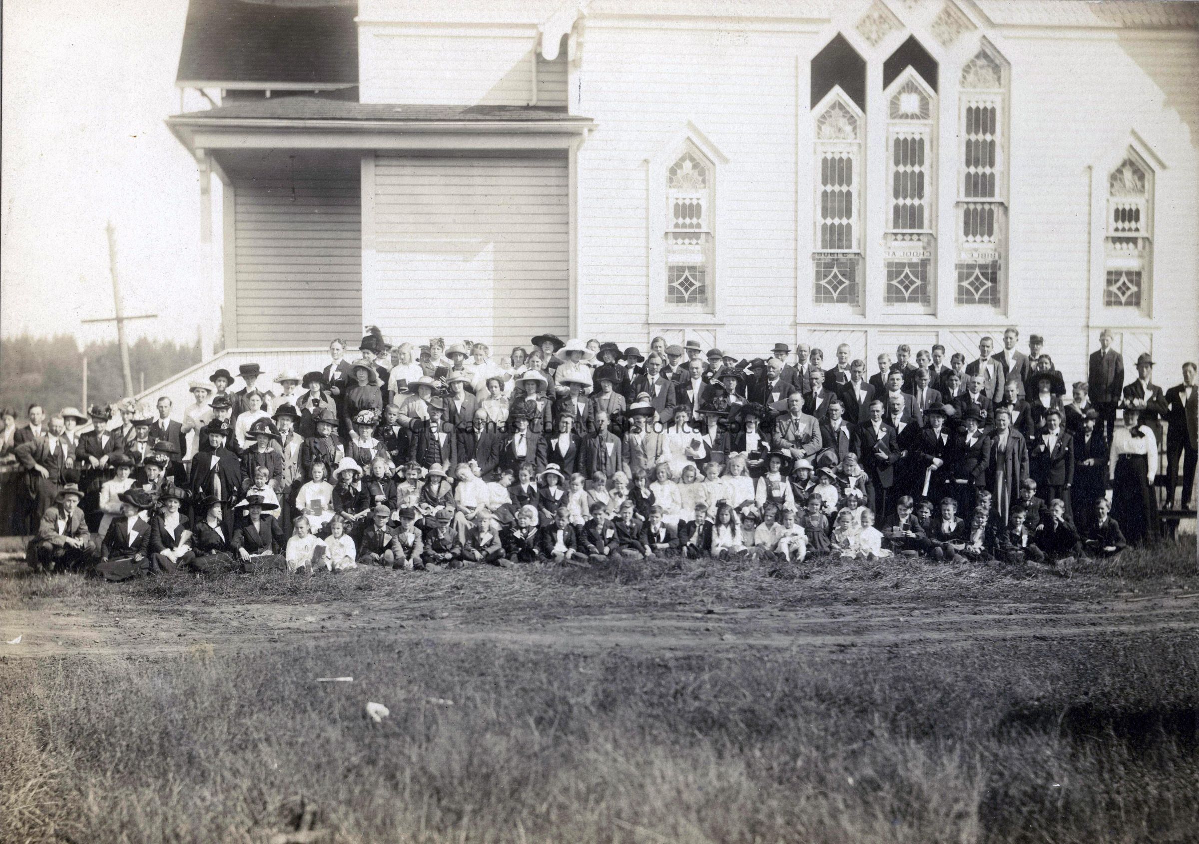 Taped to the back of the photo: "The Christian Bible school at Gladstone, Ore., was organized in 1908 by A.H. Mulkey, one of the veteran preachers of the great West. This school has enjoyed a steady growth ever since its beginning. Last Rally Day, October 5, was the biggest day in its history so far, there being 178 present in that occasion. Before Rally Day the average attendance was about 100. Since then it has ranged from 12- to 130 and is still on the upgrade. The whole school seems to have caught the vision and is looking forward to the day, not far distant, we hope, when 200 shall be the rule and Gladstone shall have the largest and most efficient Bible school in Clackamas County and one of the best in Oregon. The present misister of the church, R.L. Dunn, is teacher of the Young Men's Progressive Class, and an enthusiastic worker inthe school. The city of Gladstone, a beautiful enterpirsing little place, has only this one Bible school, and the people are fast coming to appreciate and support this splendid work. This is not the last word from Gladstone -it is going to be heard from right along.