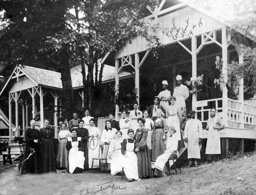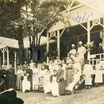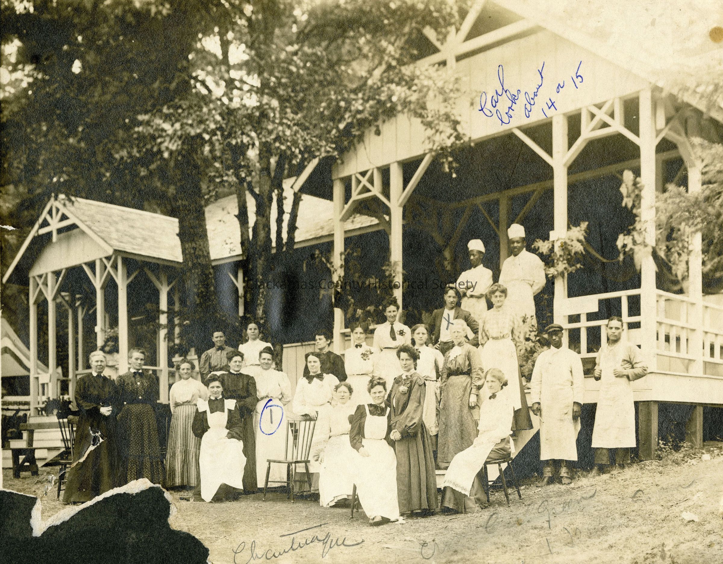 Chautauqua 1905, Gladstone Park. "Park Cook's" People gathered for group photo. "about 1905" on back of photo. On back, it says Paul looks about 14 or 15.Made/Created