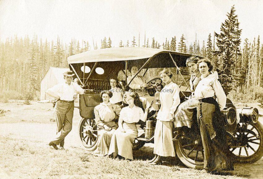 Group Posed with Car at Mount Hood Government Camp. Note on the back of the postcard states: Myrtle and girls of Oregon City Court House.Made/Created