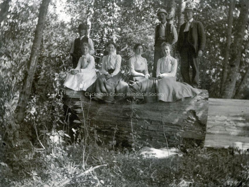 Group at Roethe's Landing on the Willamette River. Photo A: Woman on far left of log is Elsie Bachus. John Oatfield is standing on the log at the far right. Others are not identified. Photo B: Elsie Bachus is identified as the woman standing on the ladder. John Oatfield is identified as the man on the far right. Others are not identified. John Oatfield and Elsie Bachus were married in 1908. P-3130 and P-3131Made/Created
