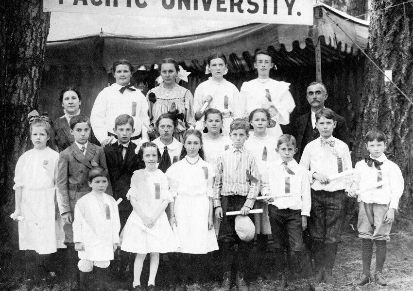 Group of Classmates. Banner in background reads "Pacific University." Roberta Schuebel is in the front row second from the left. The man on the right side is H.N. Smith.Made/Created
