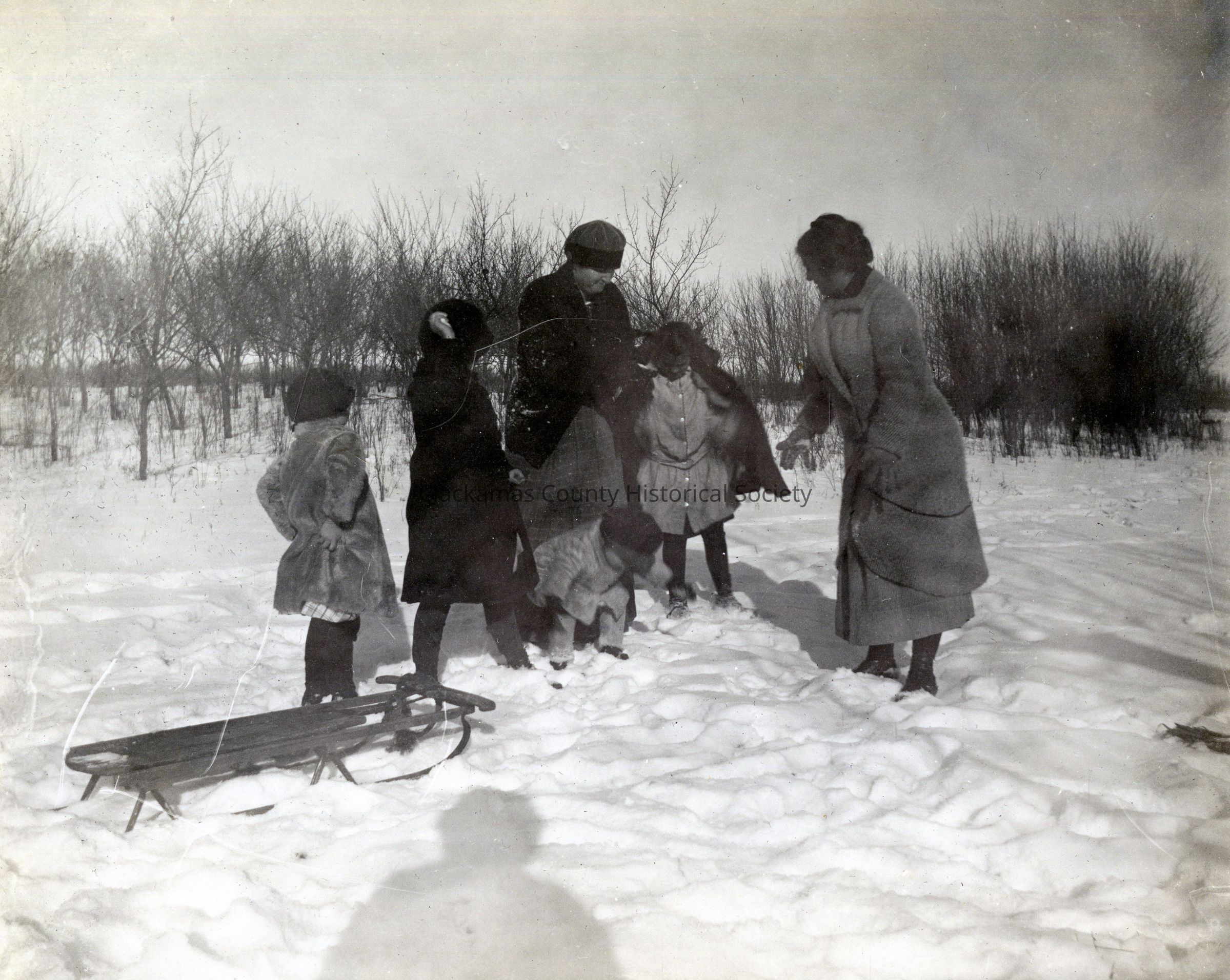 Group of Unknown Women and Children Playing in the Snow with a Sled