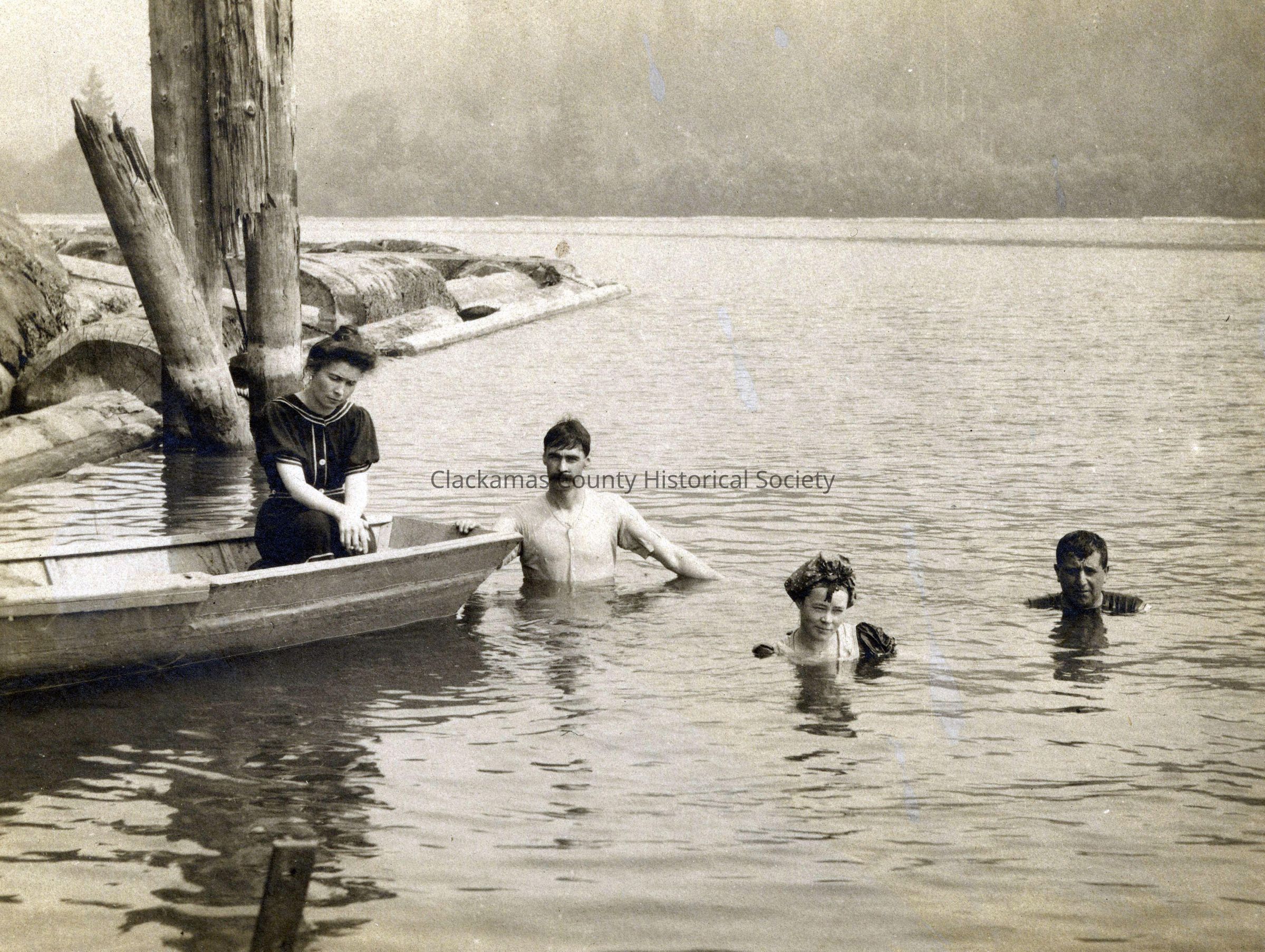 Group Swimming in Willamette River below the Falls. The woman in the boat is Verna Oatfield and the man in the water at rear of the boat is Bob Oatfield.Made/Created