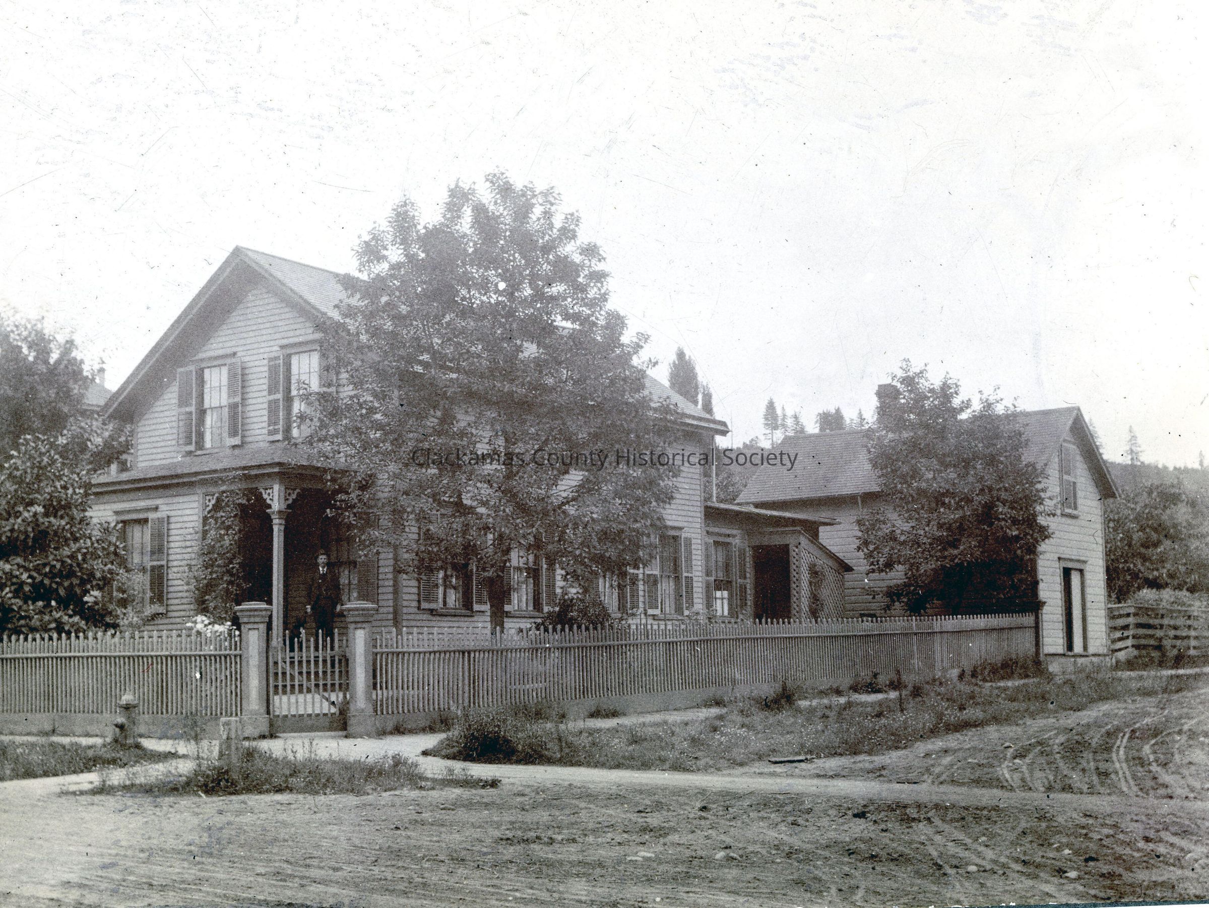 H.C. Stevens House, located at 7th and Washington, Oregon City. The back of the photo states that Robert Caufield's built the house for their daughter, Mrs. Ed (Clara) Eastham. The house was then sold to H.C. Stevens and later was moved to 9th and Monroe Streets.