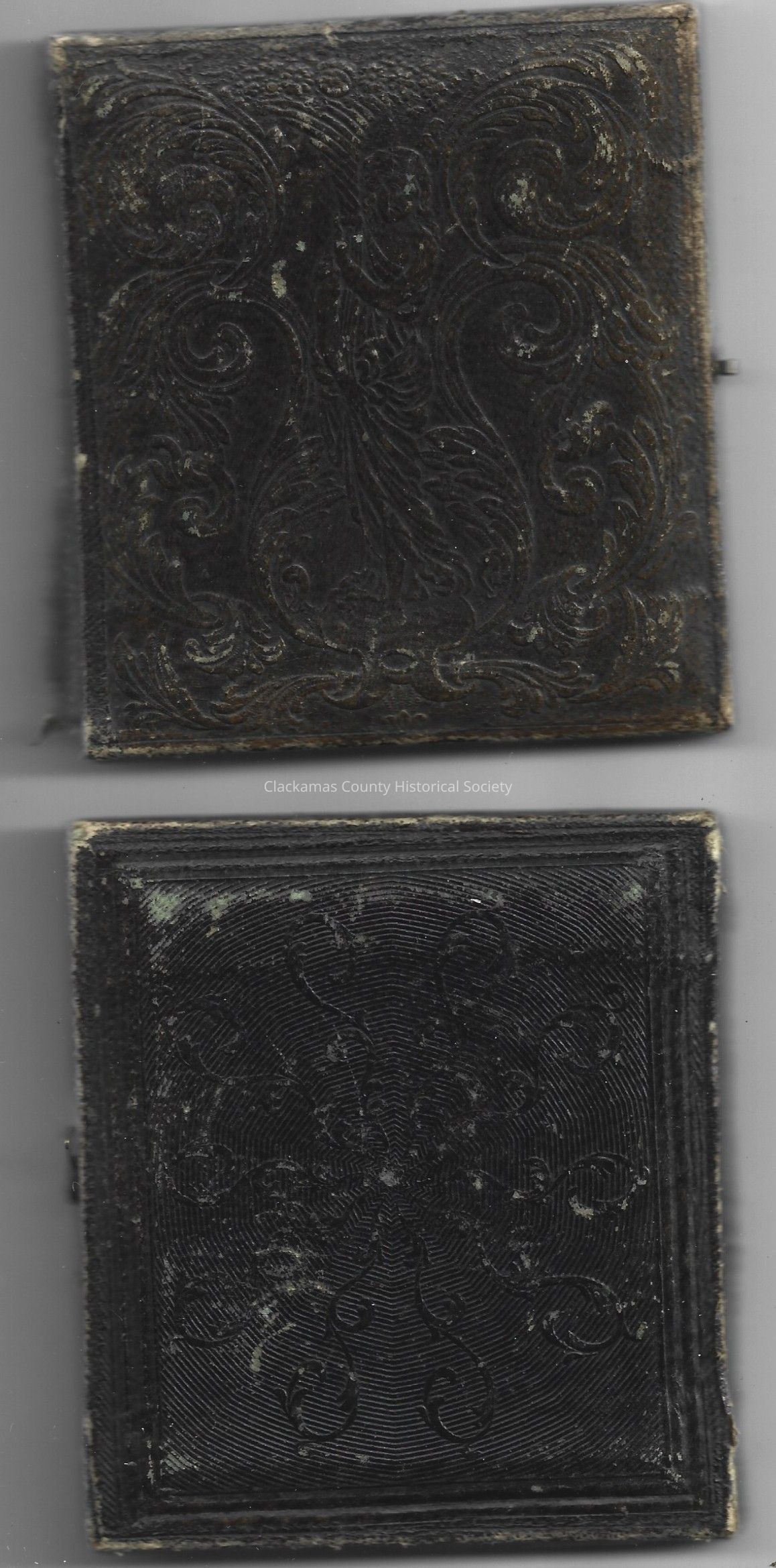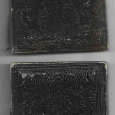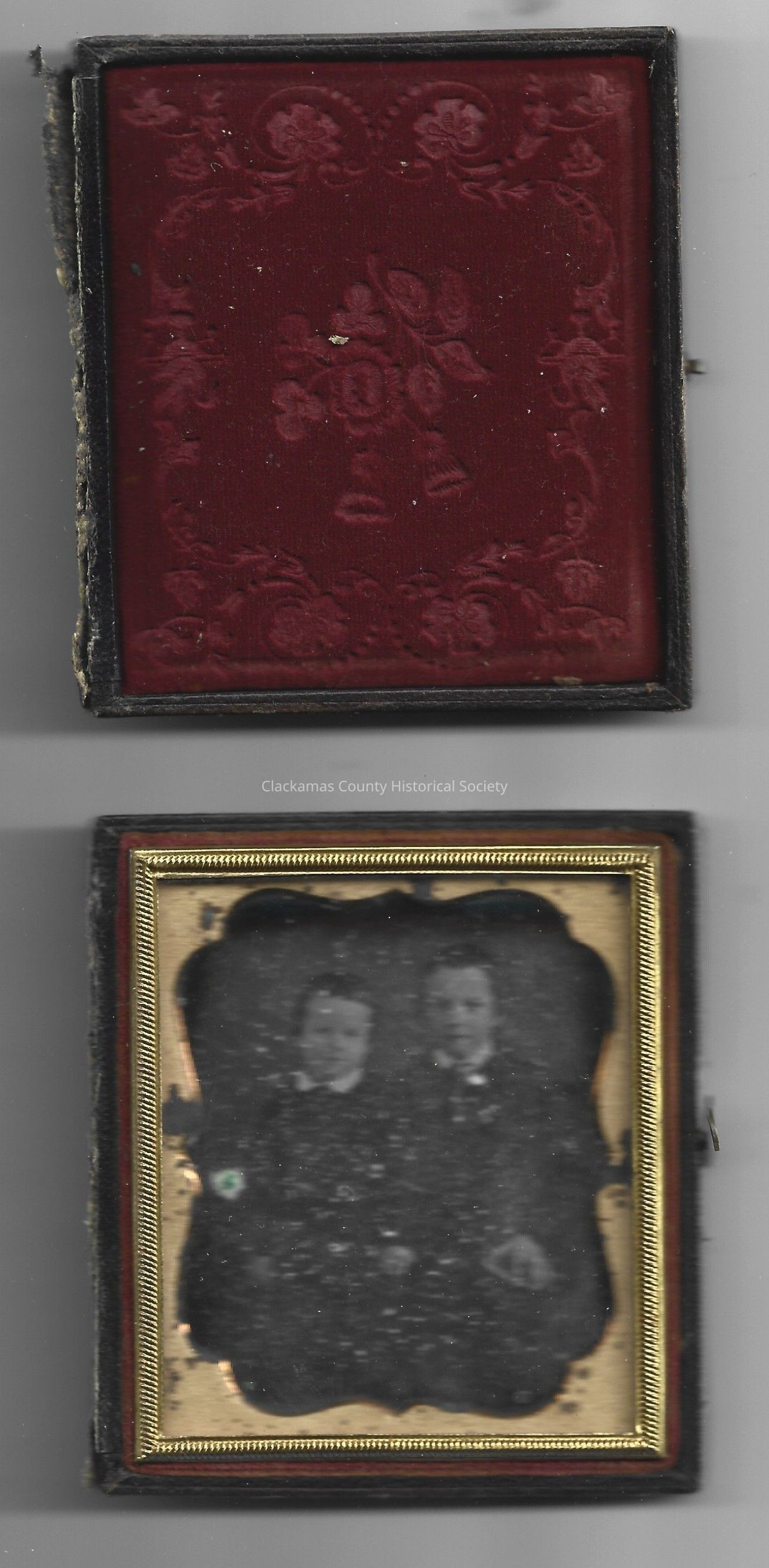 Daguerreotype in book frame of Harley & Clarence Stevens.