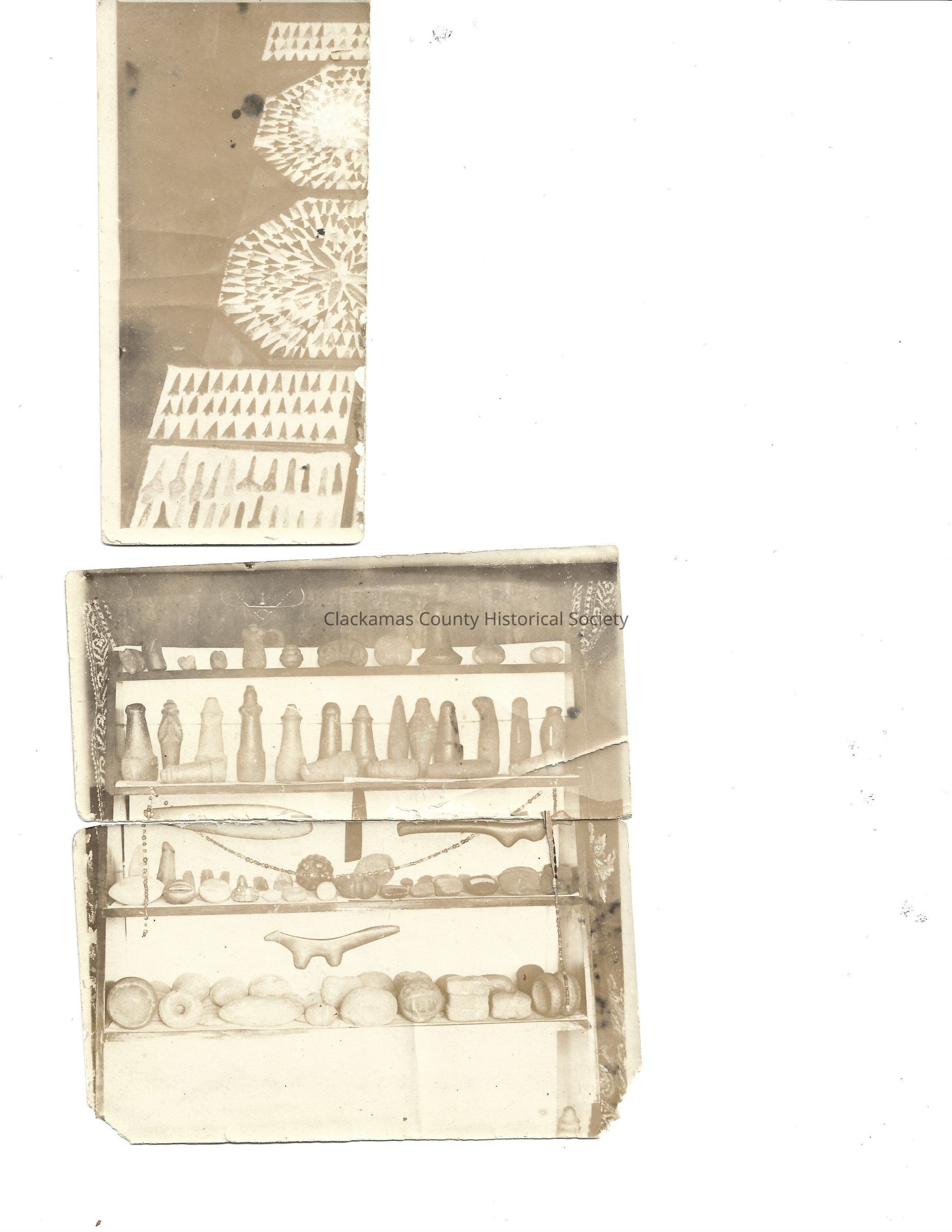 Heavily faded and damaged set of photographs of Harley Stevens Sr. collection of Native American artifacts. Sent from American Museum of Natural History to C.H. Dye Esq in Oregon City.