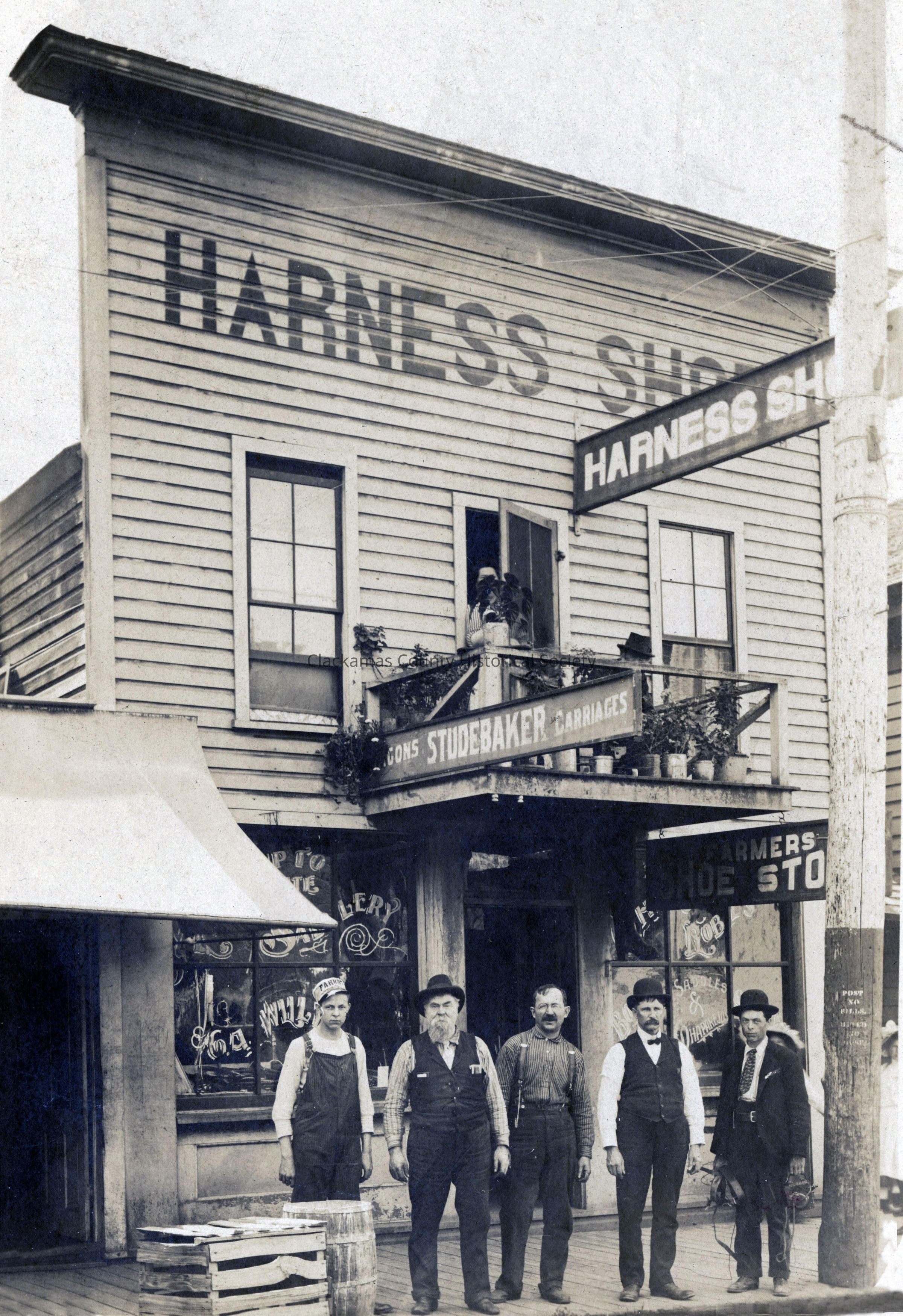 Harness shop on 7th and Main Street, about 1900. Five men in front of store and one woman upstairs in doorway. Also, man(?) uptairs with hat on and peering over the railing. Dad, about 14 years, Dad Willey; Doll____; Amber Schally. ?. Farmers Shoe Store on an sign. Studebaker Carriages on a sign.Made/Created