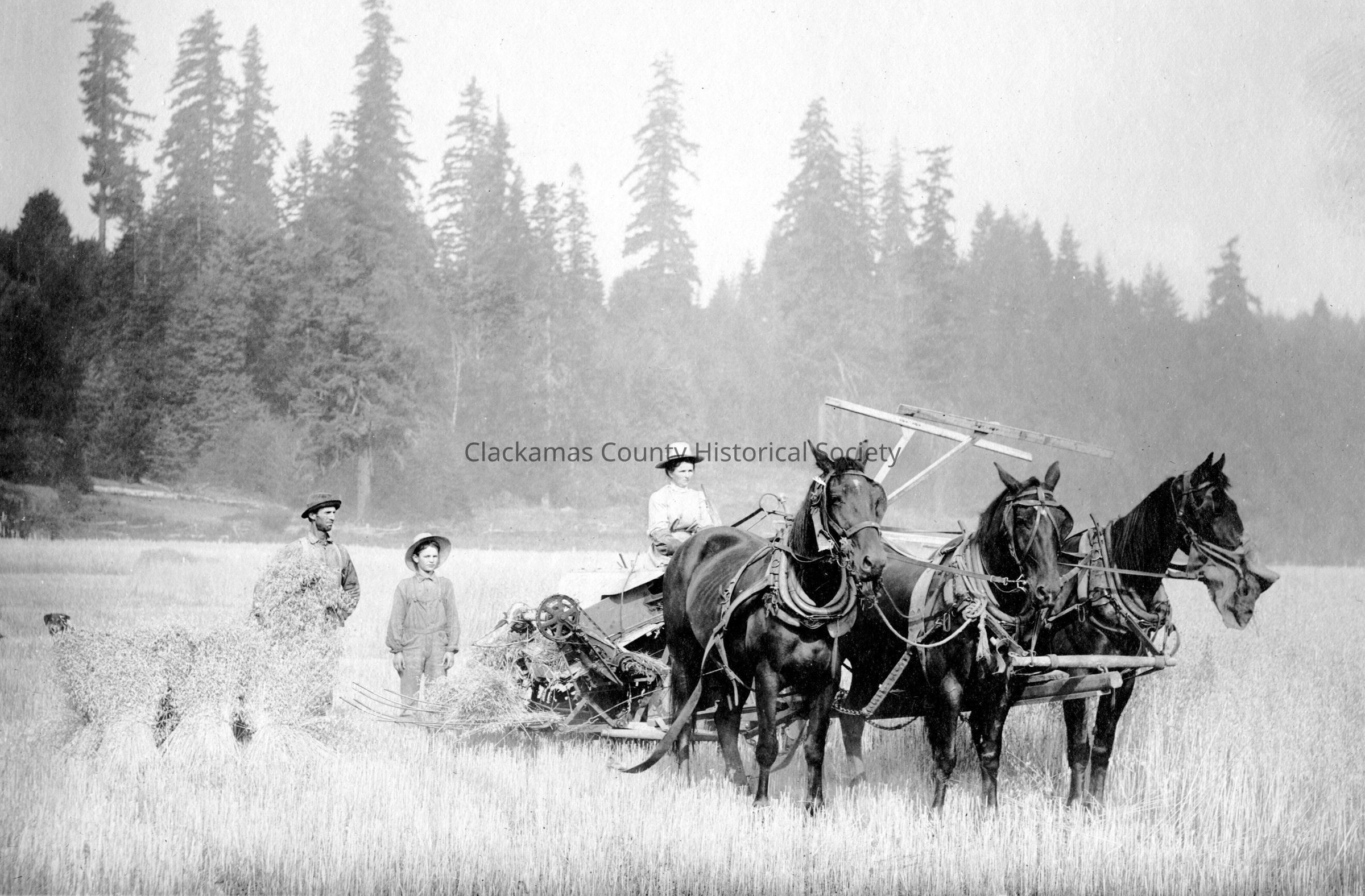 Harvest on the Cromer Farm. From (L-R): 1) Winfred Cromer; 2) Jesse Cromer; and 3) Carrie Cromer, behind team of horses.
