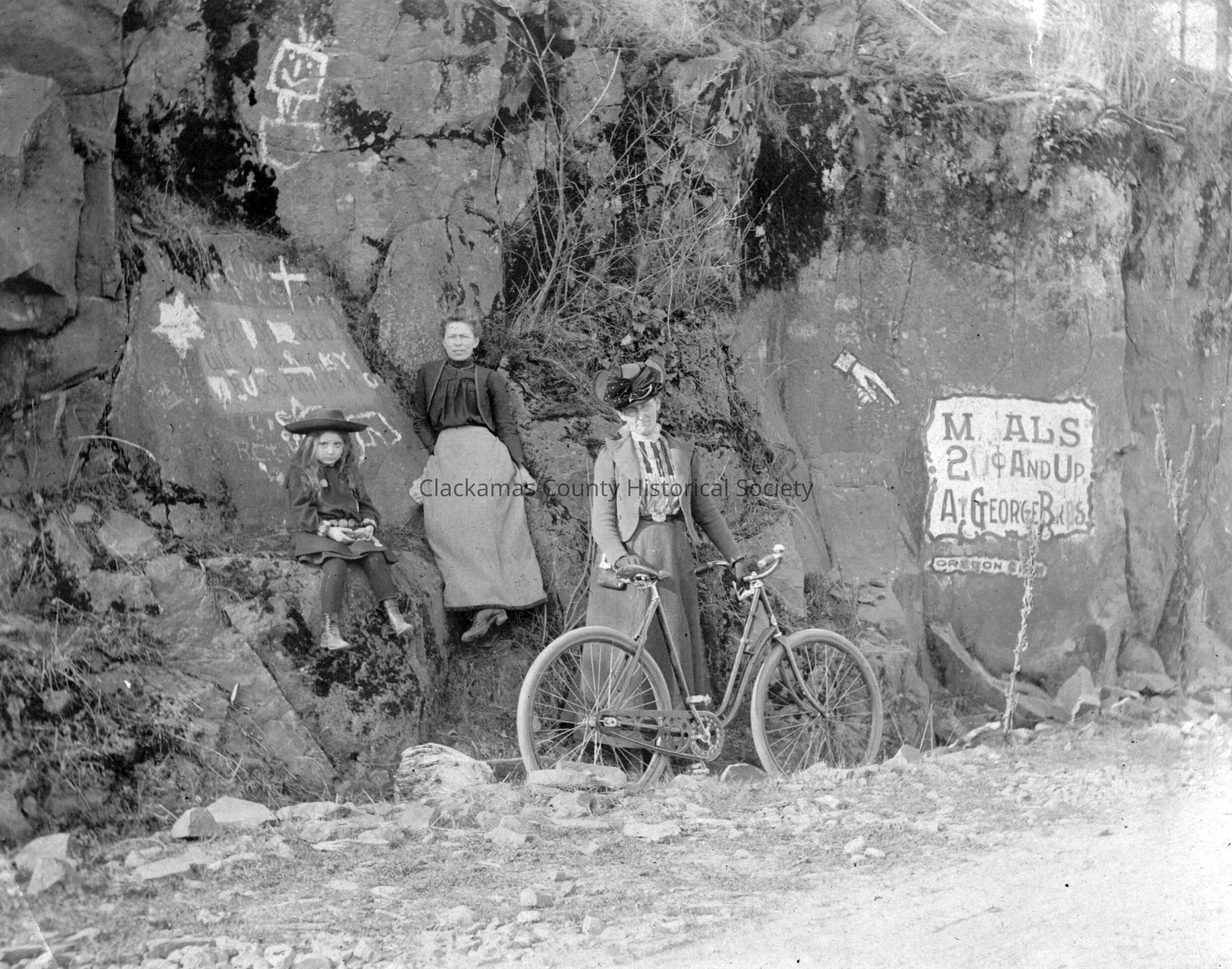 Hazel Kennedy Humphrys with her mother and another woman. Hazel is the girl seated on the left. Graffiti in background.Made/Created