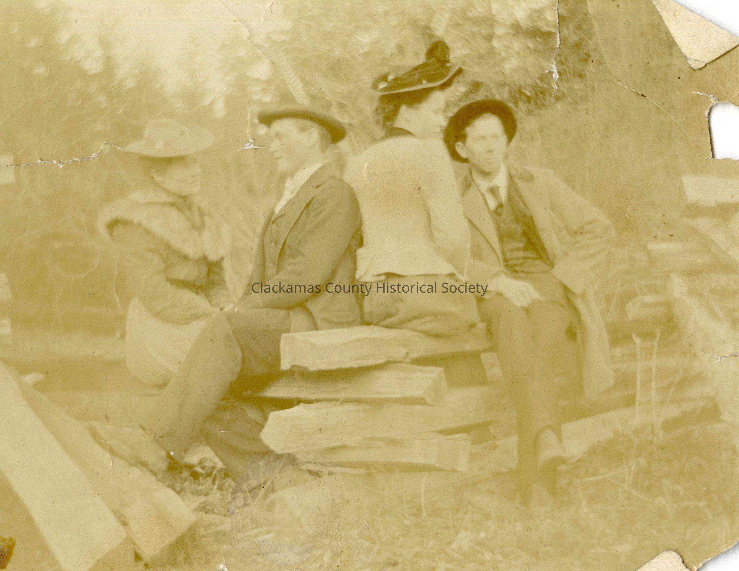 Lee and Dora Herrington (r) with unidentified man and woman sitting on wooden fence railsOther Names and Numbers