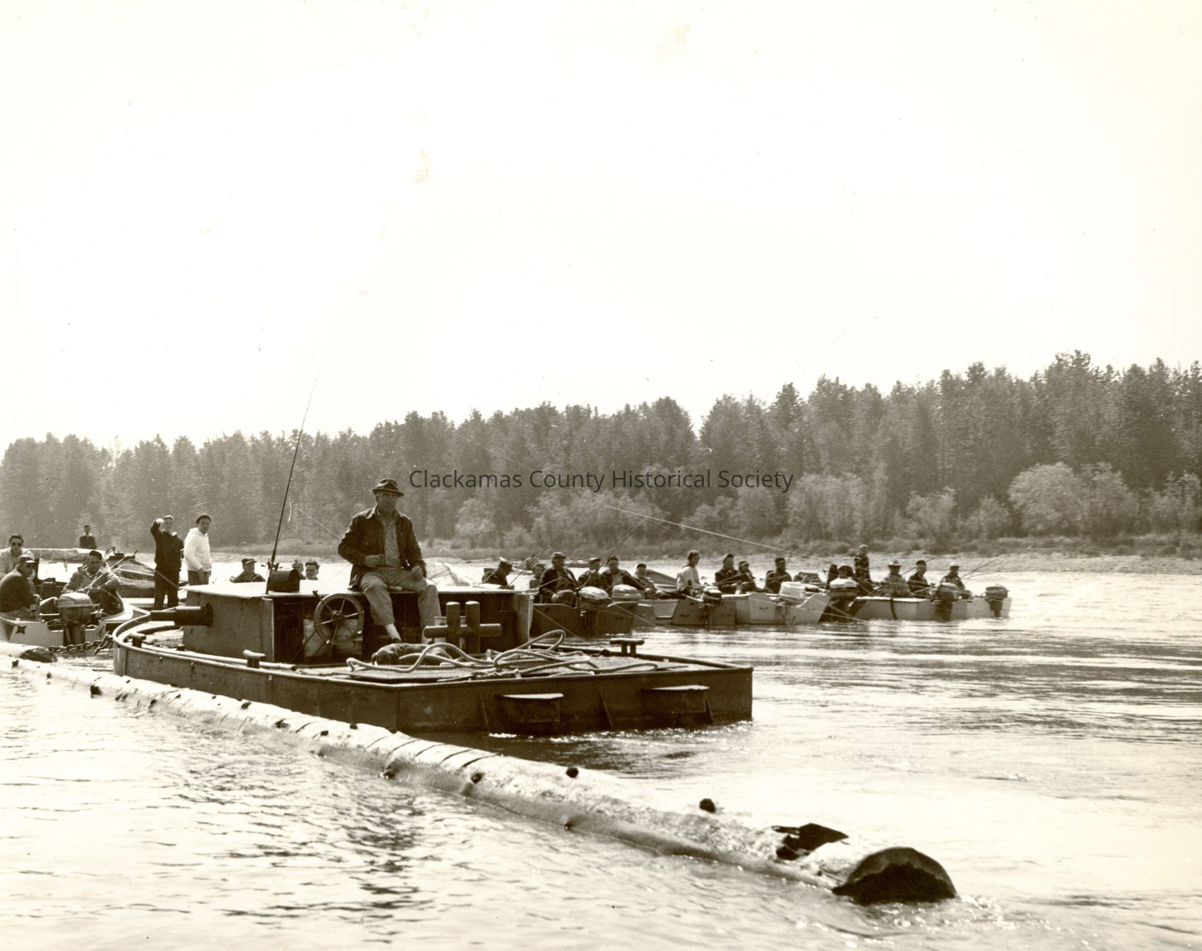 Fishing at Willamette Falls. "Hog Lines". Boats, fishermen. Josie Barnett Collection