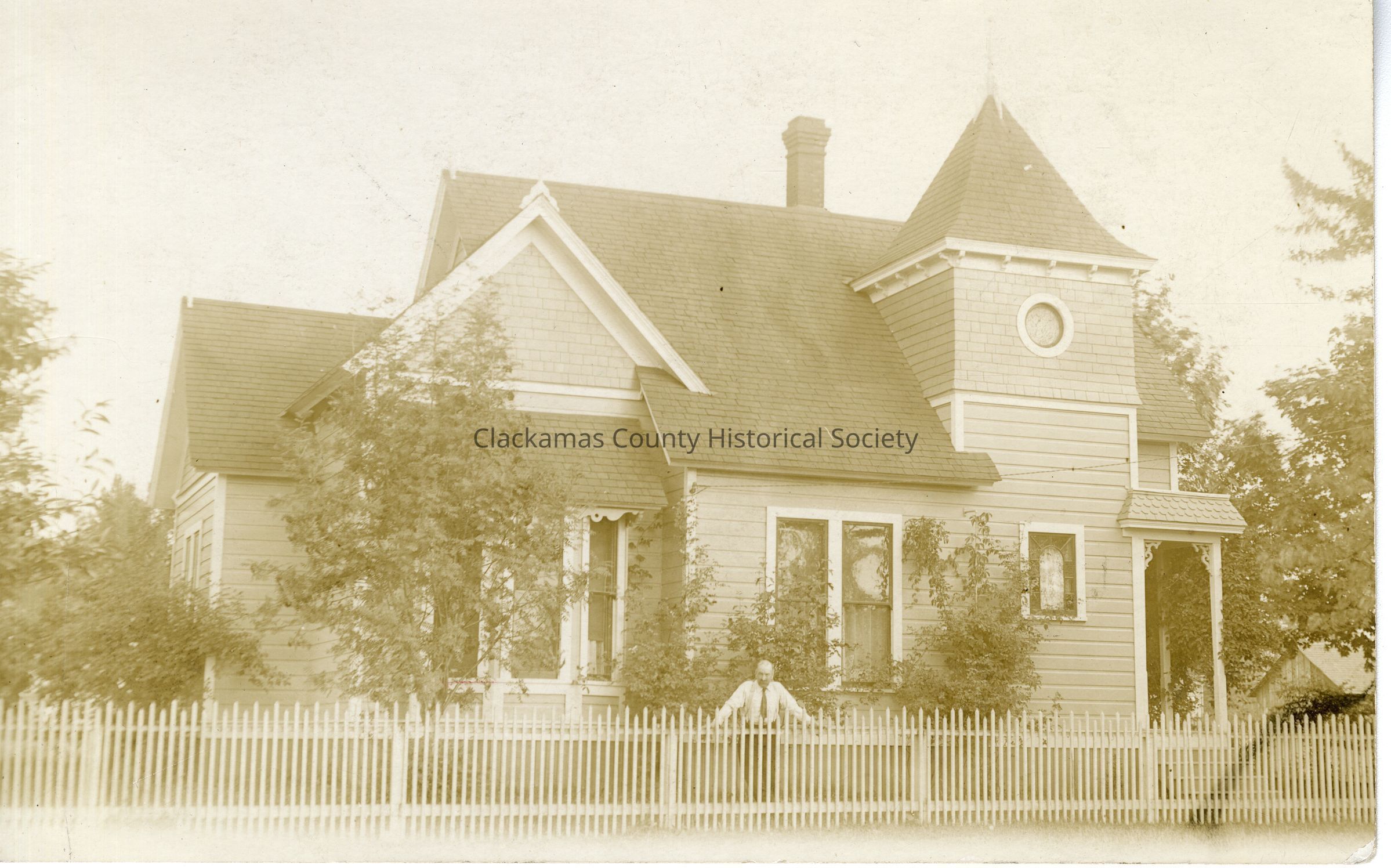 Photograph Post Card of house owned by Anson and Emma (Brock) Hollingsworth in Gladstone, Oregon, in the 1920's. Anson is standing in front. No postmark or written message on back.Made/Created