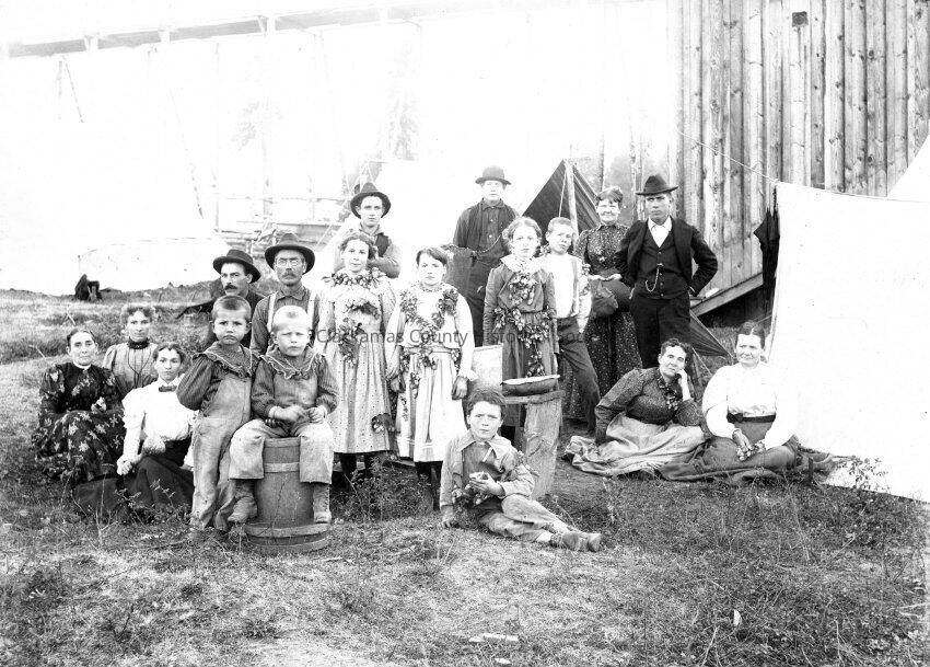 Hop Picking Group. Dressed for festival after hop picking finished. Adults and children. Tents. Hop picking hangings.Made/Created