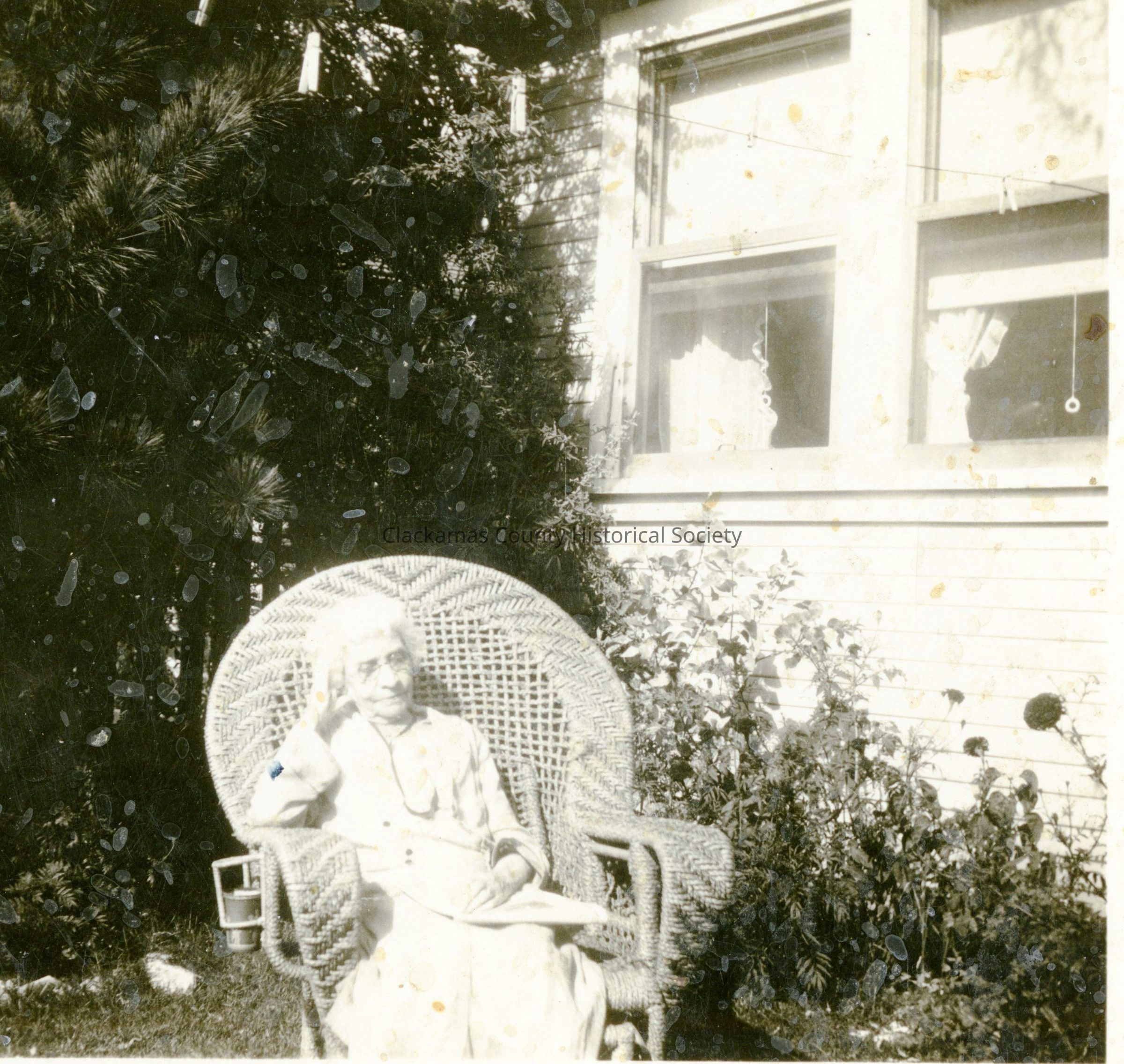 Lisbet Hopy sitting in wicker chair in Mary's yard