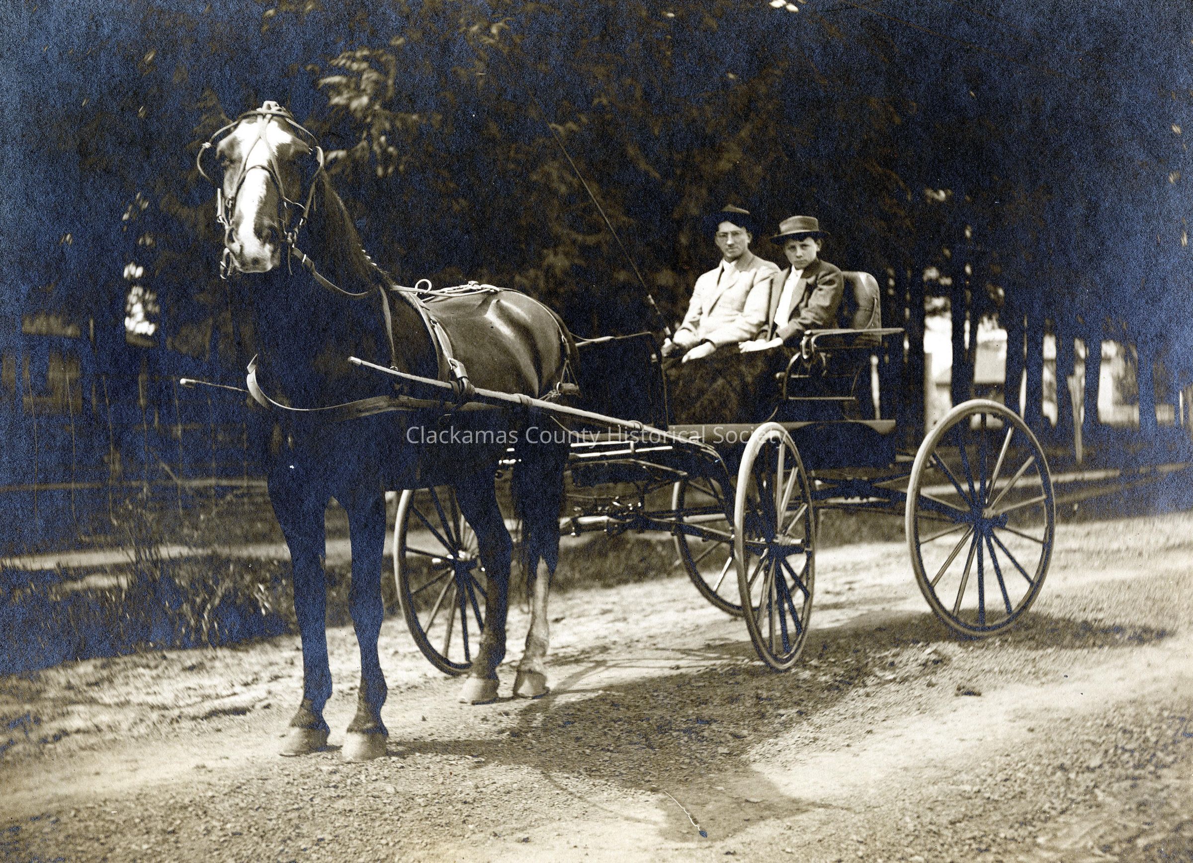 Horse and buggy on Columbia River road Gift of Horace and Dorothy Gross Man and young man