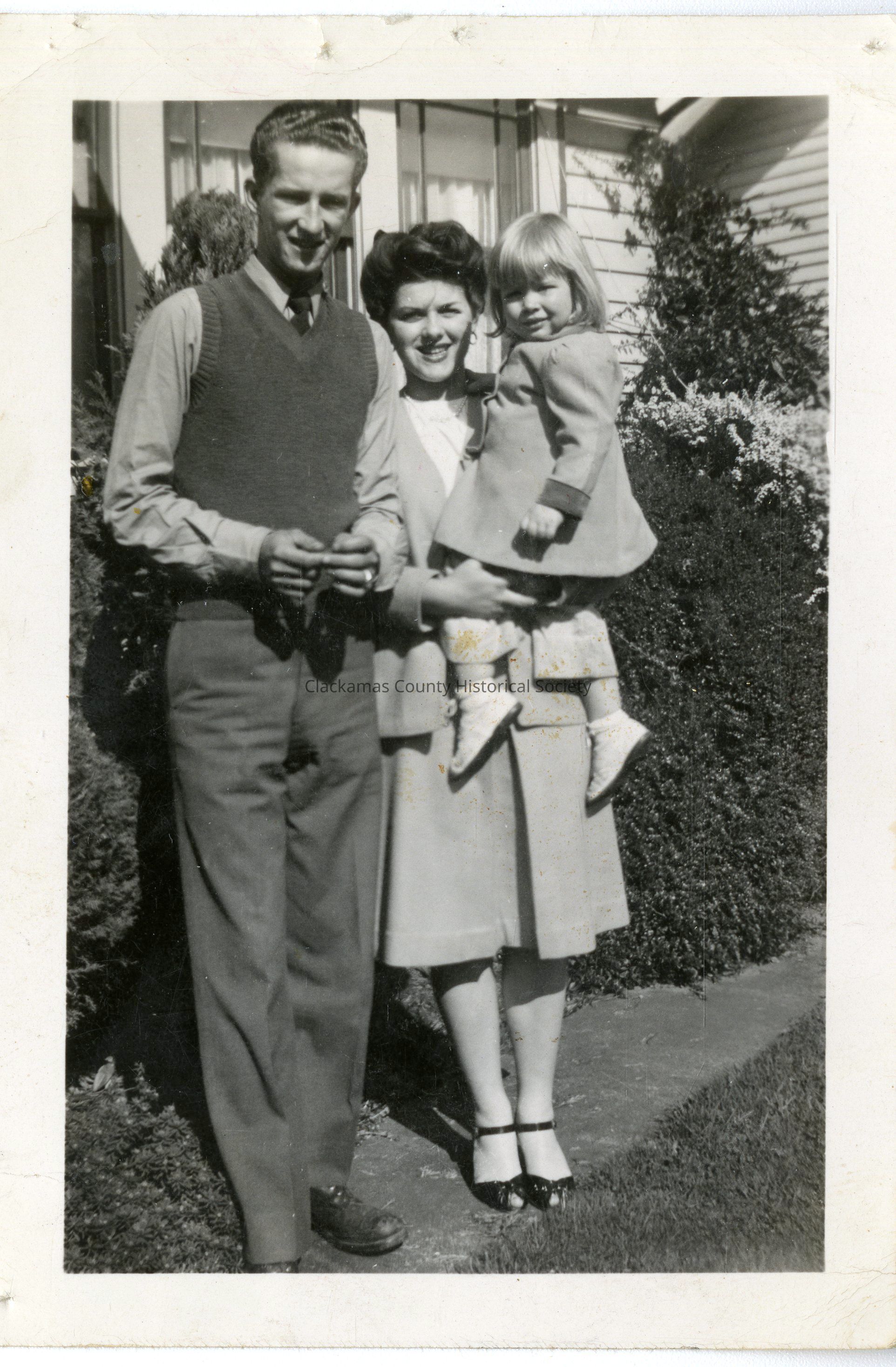 Laura Hoss and Bob Ross standing in front of a house, Laura holding an unidentified girlOther Names and Numbers