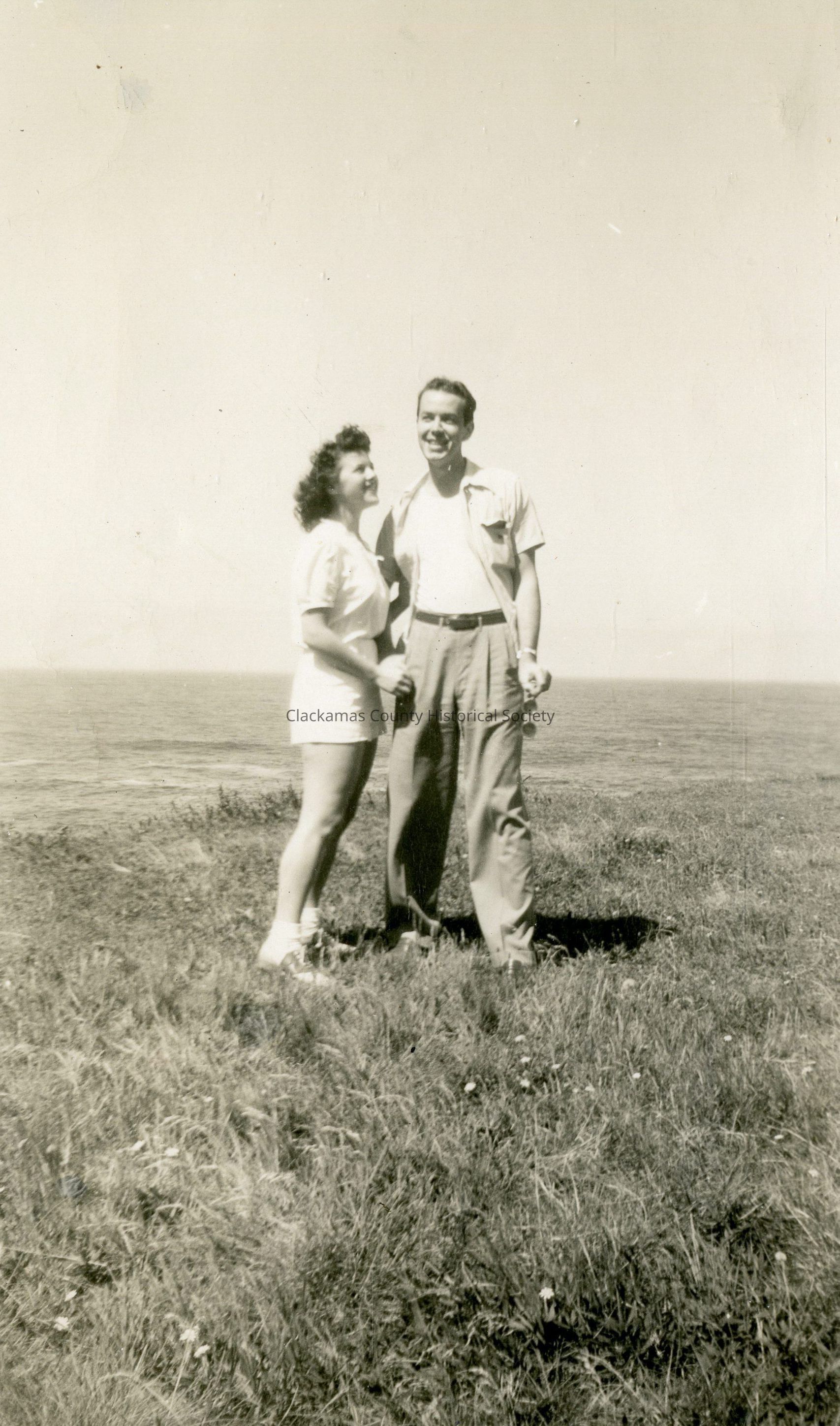 Laura Hoss and unidentified man (possibly Roy Hoss) standing on bluff near oceanOther Names and Numbers