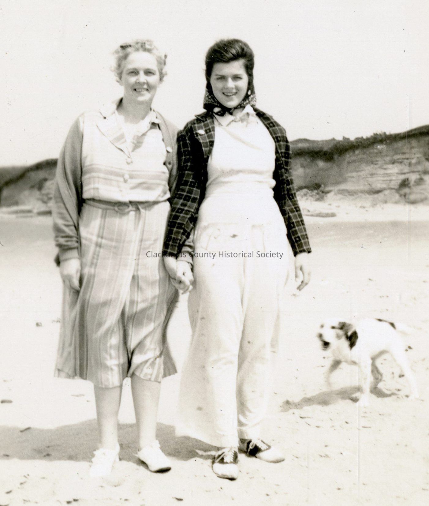 Myrtle (Lantz) Hoss and daughter, Laura May Hoss with dog at the beach