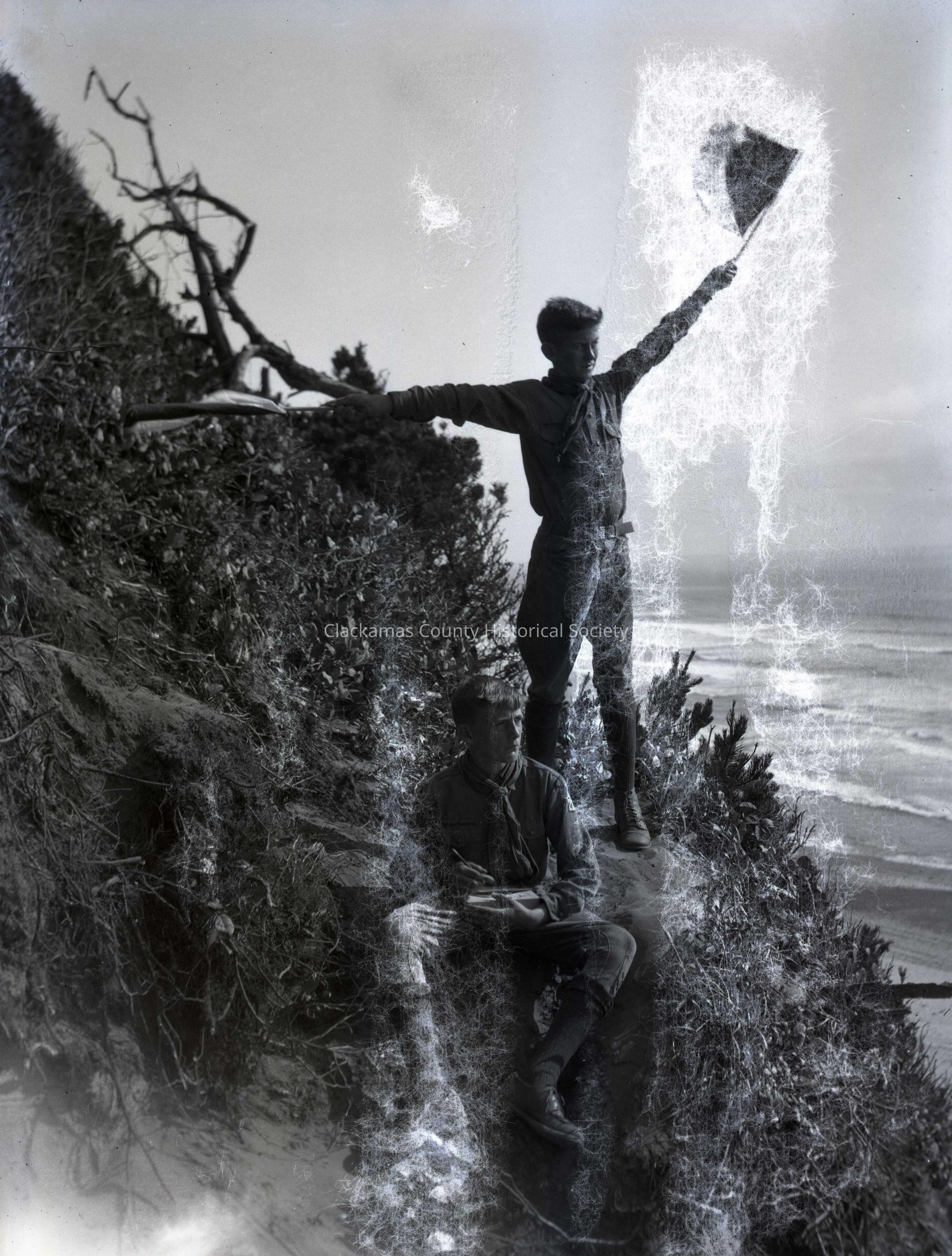 Howard Eberly, George Osborn Troop 220, Boy Scouts Camp Merriwether, Oregon. The Scouts are practicing their flag signaling skills.