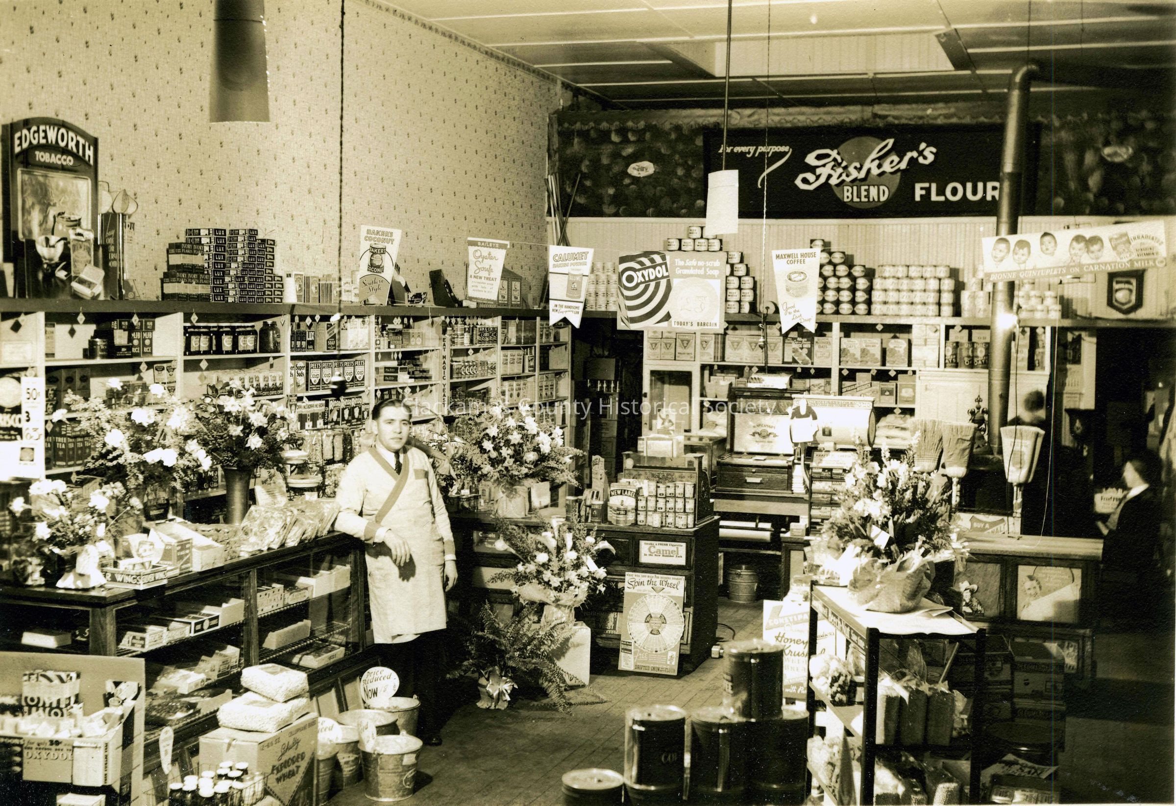 Hub Grocery; Red and White Store. Both names on photo. January 29, 1936. Interior of grocery store. Male person may be Miles Burleigh. Female also in the store.Made/Created