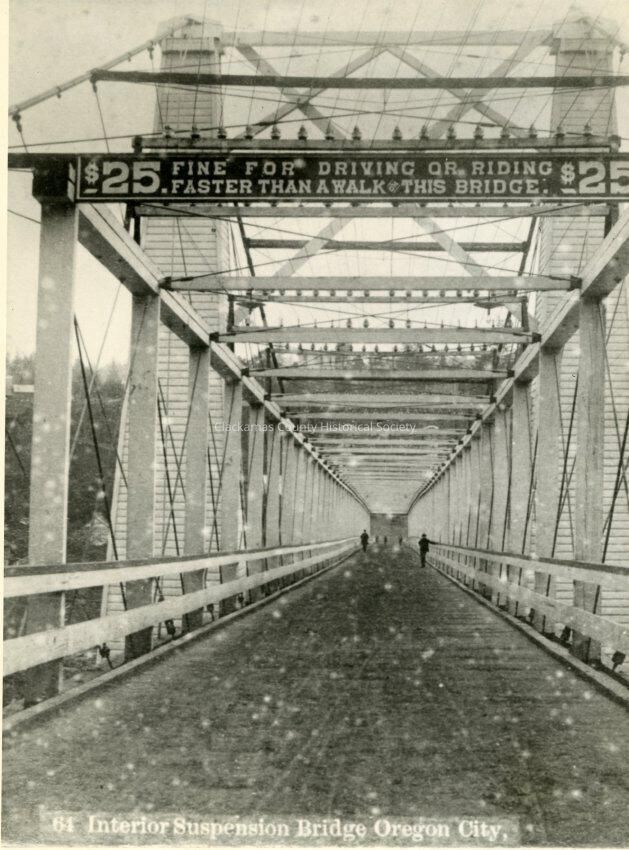 Sign above entrance reads: "$25 FINE FOR DRIVING OR RIDING FASTER THAN A WALK ON THIS BRIDGE."Made/Created