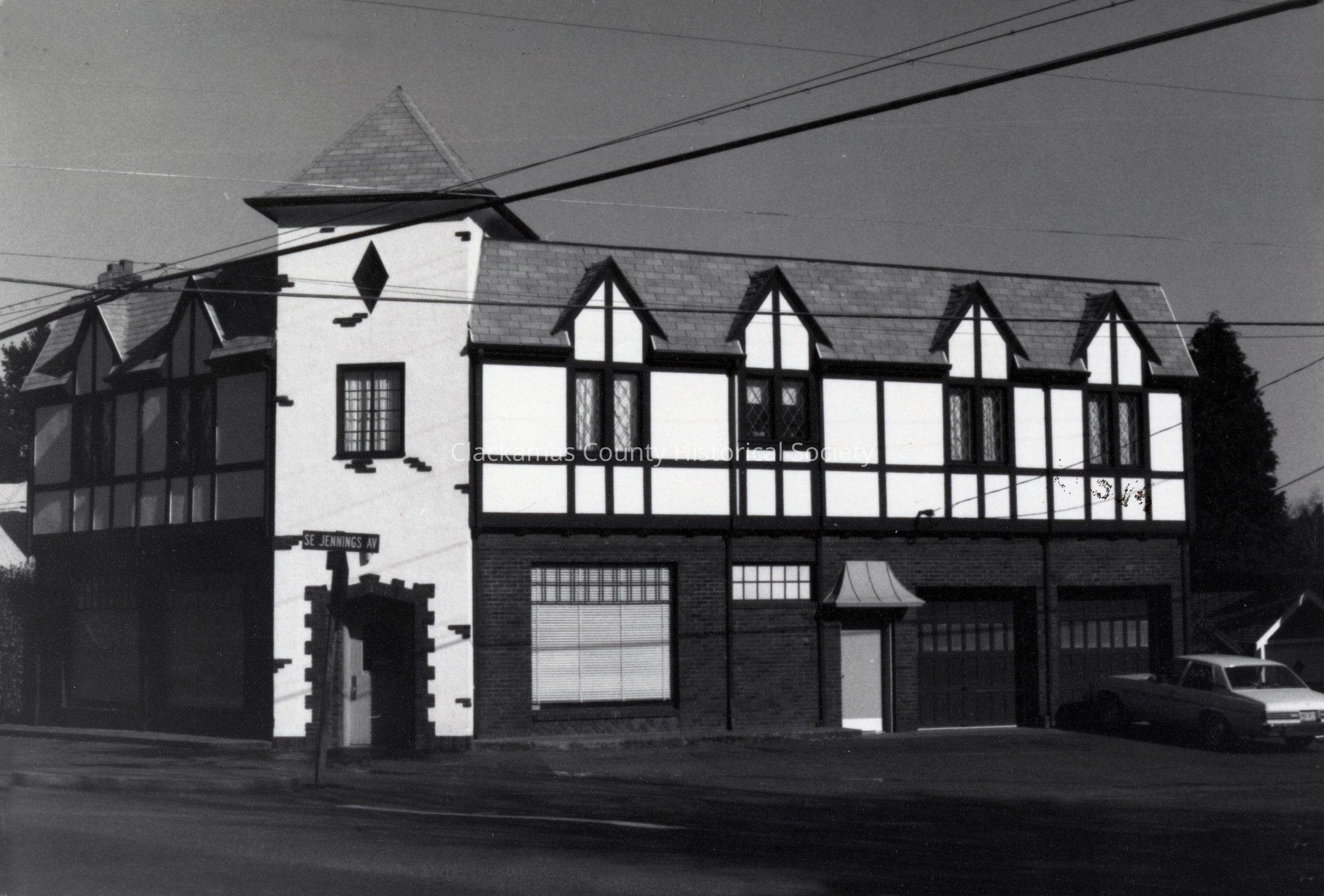 Photo marked Oak Grove Fire Hall in Buchanon Building. Built 1928. Tudor Style Commercial Building.Made/Created