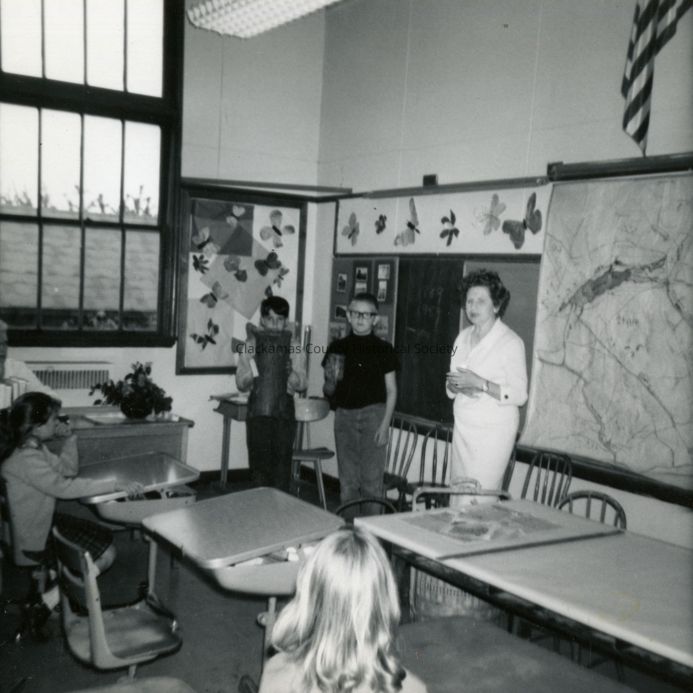 Note in folder - Mrs. Goodall explains uses of the "picker", held by Kuret Bevers on right and the "packer" on left that Tommy Eddy holds in Irma Sullivan's fourth grade at Jennings Lodge.