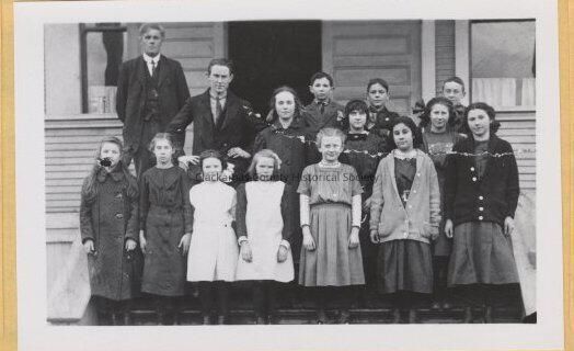 Le Clair Plalf, Bessie Maple, Dores Winglove, Ruth Cook- Lowitt, Dora Rothe , Mary Pierce Nawrocke, Ann Russell Randall, teacher Geo. Tompson, Clyde Cutain, Emma Berry, Glen Russal, David Downing, Mary Brichard - Tripp, Lloyd Curtin,